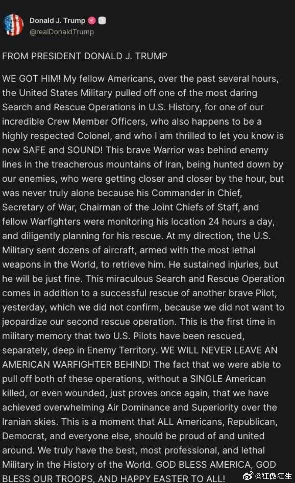 伊媒称多名美军士兵在营救行动中身亡 4月5日,特朗普TruthSocial网站向