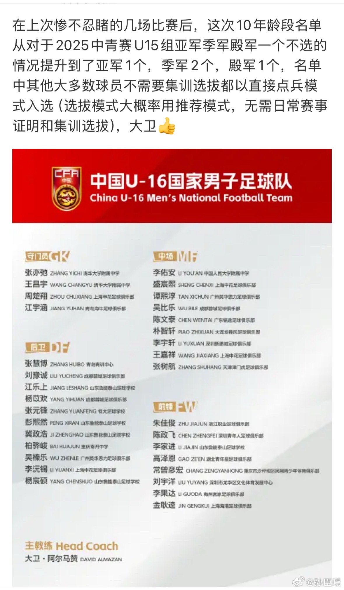 1月份发博文刚夸过选材问题,结果是公布名单后,陈文泰(无任何伤病情况下)无故被其他球员顶替,另高泽恩也变(未知具体原因).也就是2025年U15中青赛亚军队伍队员还是无一人可以入选.这次蒙太古杯 输球和之前一直输球问题,确定不是选人问题,中青赛前五名的队伍队员都很费劲入选国少.其他人员都是哪里来做参考进来的?