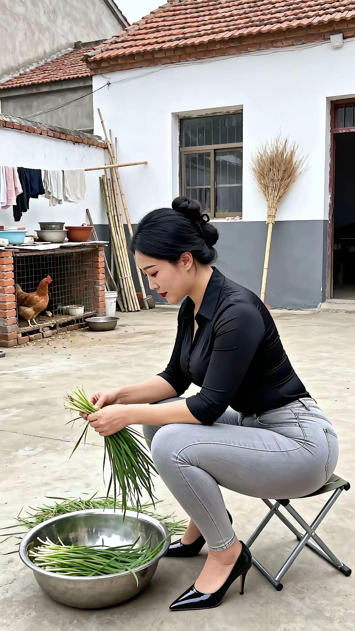在田野中,优雅的绿条纹衬衫与黑色高腰裤搭配,尽显时尚与自然之美。