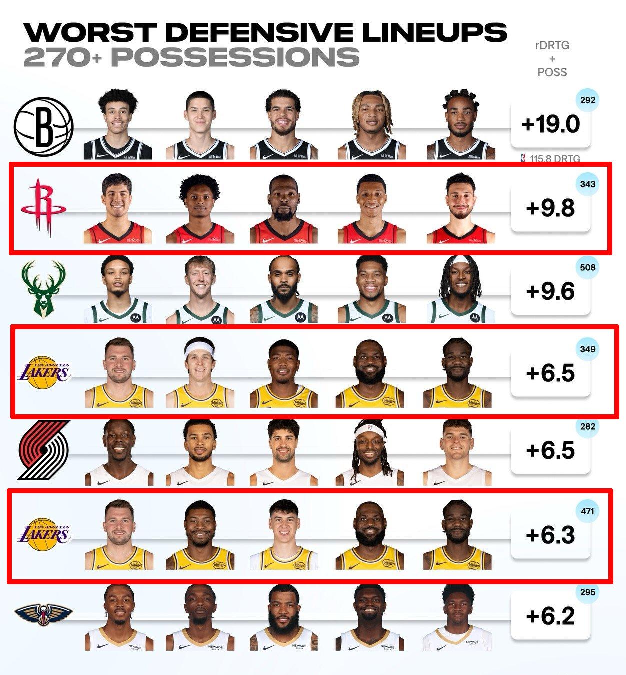 看看这张“本赛季最差防守阵容”的榜单,难怪湖人和火箭都觉得对方是软柿子呢! 这个榜单上,就只有湖人和火箭是季后赛球队,其他的要么是附加赛球队,要么就是连季后赛都进不去的鱼腩。湖人那边有东契奇和里夫斯两个攻强守弱的后卫也就算了,火箭这边进攻吭哧瘪肚的,怎么防守也这么不给力啊? 甚至这个火箭的这个“最差防守阵容”还是火箭最近常用的首发阵容,谢泼德除非三分手感火热,能在进攻端火力全开,否则他在场上就是拖后腿的存在,会被对手追着打,特别是到了季后赛,他对抗不行和控运差的缺点会被进一步放大,也不能指望乌度卡能帮他“扬长避短”了……