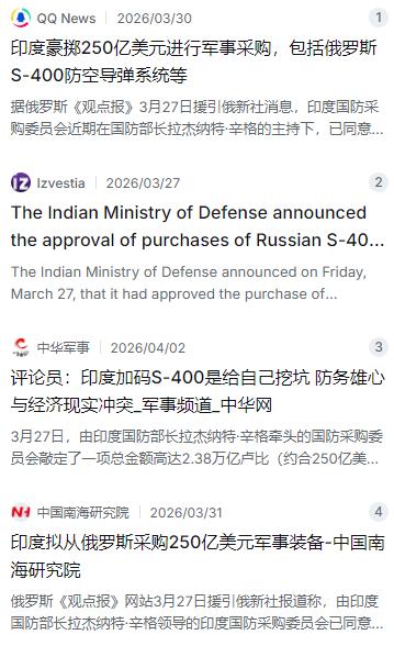 刚结束和美国的密谈,印度就猛地砸下了一个惊天巨雷!谁能想到,莫迪大手一挥,直接敲定了一笔2.38万亿卢比的"天价"军购大单。 麻烦看官老爷们右上角点击一下“关注”,方便您进行讨论和分享,感谢您的支持! 这笔钱到底有多大?2.38万亿卢比,折合下来差不多250亿美元。说个对比你就明白了,当年印度买那36架“阵风”战机已经够轰动了,可这笔订单的金额是那个的三倍还多。更吓人的是,2026年2月份印度刚批准了增购114架“阵风”的意向,那笔订单本身就要花差不多3.25万亿卢比,两笔加一起,2026年印度在买武器上砸的钱直接奔着5万亿卢比去了。 清单里的东西也确实够硬。俄罗斯的S-400防空系统是绝对的主角,这批系统将用来防御远程空中威胁,保护印度的重要目标。除此之外,还有中型军用运输机,用来替换老掉牙的安-32和伊尔-76机队。攻击无人机也在采购名单里,专门用于进攻性作战、侦察和空中协调。空军方面还要把苏-30战机的发动机整体翻新升级,延长这款主力战机的服役寿命。陆军也不落空,拿下了新的防空系统、坦克用的穿甲弹、“达努什”火炮,还有不需要机场就能用的空中监视系统。海岸警卫队那边则批了重型气垫船,专门在近岸复杂海域执行巡逻和搜救任务。 这次军购几乎覆盖了海陆空三军,从防空到反装甲,从运输到侦察,算得上是全方位补短板。但问题是,这笔钱真的拿得出来吗? 时间点上就很有意思。这笔军购是在2026年3月27日敲定的,而就在3月24日,美国总统特朗普刚和莫迪通过电话。特朗普当时主动拨给莫迪,是两人自2月底美以打击伊朗以来的首次通话,双方主要聊的是霍尔木兹海峡的安全局势和西亚冲突。更耐人寻味的是,就在莫迪和特朗普通话前后,美国国防部副部长科尔比刚好在新德里访问,从3月23日待到26日,跟印度外长苏杰生等人见了面。这边美国高官刚走,第二天印度就砸出250亿美元的军购大单,很难让人相信这只是巧合。 莫迪这笔军购大单,表面上是给自家国防升级,但怎么看都像在美俄之间玩“平衡术”。一边跟美国高官密谈、跟特朗普通话,一边扭头就从俄罗斯买S-400这种顶级装备。可问题是,如今的俄罗斯军工产能被俄乌冲突严重牵制,交付能不能按时都两说。而且S-400在俄乌战场上的表现也没那么神,核心雷达组件被无人机和导弹打掉的情况时有发生。印度花了250亿美元,能不能买到想要的防御效果,还真不好说。 更让人捏把汗的是印度的财政状况。2026到2027财年,印度国防总预算是7.85万亿卢比,折算下来约850亿美元,确实是创了历史新高,比上一财年增长了15%。但这笔预算里,真正用来买新装备的“资本支出”部分只有2.19万亿卢比,占总预算的28%左右。剩下的大头花哪儿去了?人员工资占了26.4%,养老金占了21.84%,这两项加起来就占了将近一半。剩下的还要养装备、搞日常训练、维护基础设施,能挤出来买新武器的钱本来就有限。 现在莫迪一口气批准了2.38万亿卢比的军购,这笔钱已经超过了2026财年整个资本支出的预算规模。这意味着要么这钱分好几年慢慢付,要么就得从别的地方挪。可印度联邦财政本来就捉襟见肘,每年财政收入大概2万亿人民币的规模,预算支出却高达4万亿,赤字窟窿本来就大。军费已经占了中央政府总支出的近15%,如果再大手笔加码,教育、医疗、基建这些民生领域就必然要被挤压。 还有一个绕不过去的问题,就是印度军工的自主能力。印度长期依赖外购装备,万国牌用久了,问题也越来越明显。就拿刚增购的“阵风”战机来说,法国一直拒绝提供核心源代码,这意味着印度没法自主升级战机的软件,也没法把自己的国产武器比如“阿斯特拉”导弹整合上去,战时想修改参数还得找法国点头。这种“买得到装备、拿不到技术”的困境,让印度的国防自主化口号喊了很多年,但实际进展非常有限。 更麻烦的是,印度军队手里的装备来自五六个国家,俄罗斯的战机、法国的战机、以色列的预警机、美国的运输机,各自的加密协议和数据链互不兼容,协同作战时经常出现信息孤岛。花钱买了一大堆装备,结果彼此之间说不上话,这本身就是巨大的浪费。 美国拉拢印度的心思也很明白。美国国防部副部长科尔比在印度访问时公开说,印度不仅是美国的“关键伙伴”,更是确保亚洲长期力量平衡的“必要伙伴”。但说白了,美国需要的是印度在印度洋的存在感,在西亚局势中帮自己分担压力,而不是真心要把印度扶成真正的军事强国。一旦印度真的发展壮大到威胁美国利益的地步,翻脸恐怕比翻书还快。