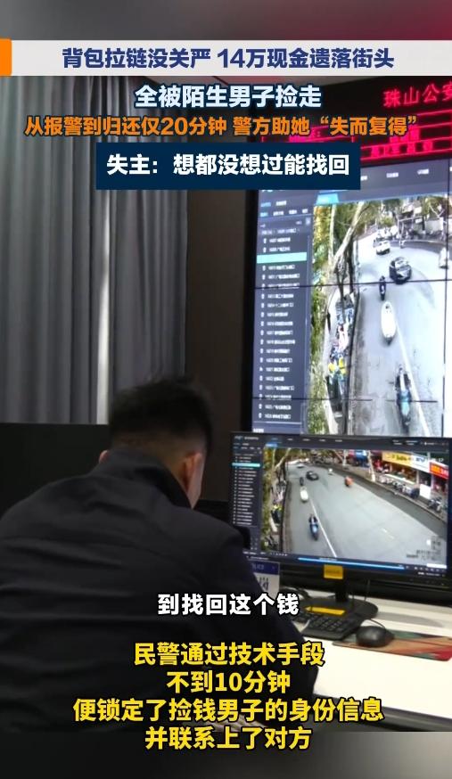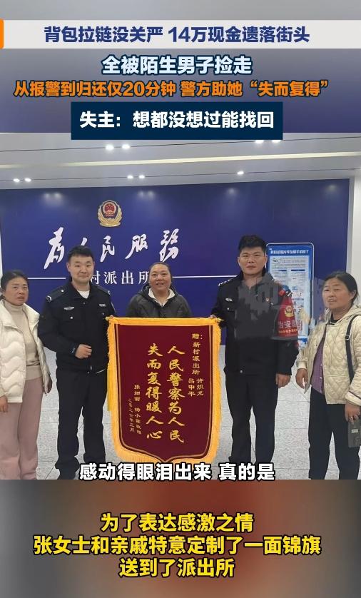 好家伙!14万现金掉街头,失主刚报警心还揪着,没想到20分钟就完璧归赵!拿到钱时,失主手都在抖,眼泪直打转:“我想都没想能找回来,真是遇上好人了!” 这事就发生在近日的江西景德镇。3月27日13时许,景德镇市公安局珠山分局新村派出所接到了杨女士的报警。她焦急又慌乱地称,自己在珠山区广场北路附近,背包里的14万元现金不见了。 原来,杨女士和亲戚从银行取了这笔钱,之后她坐上亲戚的电动车后座,由于背包拉链没关严,用黑色塑料袋装好的现金就这么从包中滑落,掉在了路边,可她却毫不知情。公共视频显示,她离开后不久,一名骑电动车的男子路过,发现了地上的塑料袋,用脚轻轻踢了一下后,便停车将其捡起,随后离开了现场。 接警后,民警吕申平一边耐心安抚杨女士,让她仔细回忆出行路线和钱款存放细节,一边迅速依托“珠视通”平台梳理线索展开调查。不到10分钟,民警就锁定了该男子的信息并与其取得了联系。吕申平向男子讲解了相关法律法规,还说明了杨女士丢失这笔钱后的焦急心情,男子听后主动表示愿意归还全部现金。 不久,14万元现金被原封不动地送回,杨女士激动地握住民警的手连声道谢。为表感激,她特意定制了一面锦旗送到新村派出所,锦旗上“人民警察为人民,失而复得暖人心”这十四个字,字字滚烫,是对民警急群众之所急、解群众之所难的最深情致谢。 这事儿既有民警的雷厉风行,也有捡钱人归还的担当,让人觉得生活里藏着不少踏实的温暖。换作是你,要是在路上捡到大额现金,会第一时间怎么做?来评论区聊聊你的想法~ 暖心警事 拾金不昧暖人心 生活中的小确幸 信息来源:都市现场。 图片来源网络,如有侵权,请联系删除。