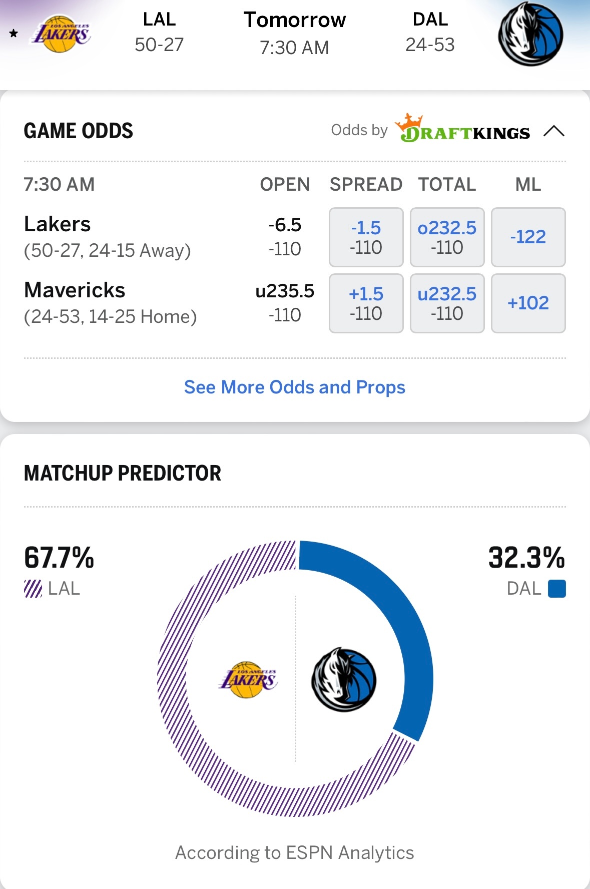 平手盘,湖人明日7点30对阵独行侠,ESPN给出获胜概率:湖人67.7%、独行侠32.3%。