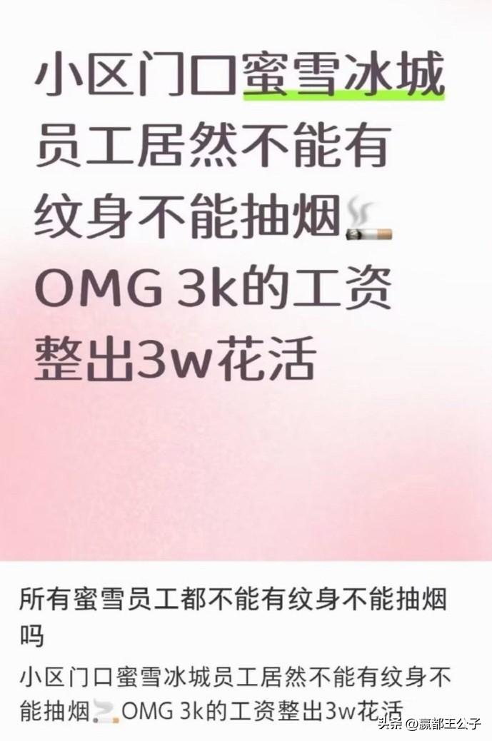 作为一家企业,而且是一家做终端零售的企业,员工不能纹身、不能抽烟,这是最起码的要求。 尤其是各种奶茶店、饮料店,其主要的客户群体是女性,而且很多都是未成年小女生。 如果其员工又是纹身,又是抽烟的,会严重影响消费者的体验,同时也会给未成年带来不好的价值导向。