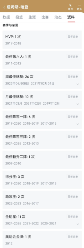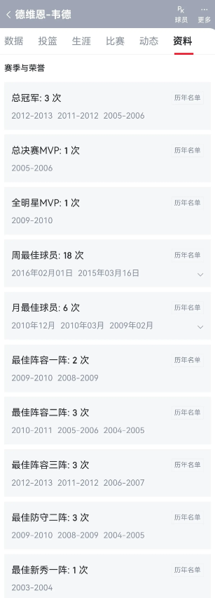 数据如下: 一是荣誉部分, MVP、周最佳、月最佳、一阵、得分王、助攻王,共6项,哈登完胜韦德。 总冠军、FMVP,全明星MVP、防守二阵、全明星次数、技巧赛冠军,也是6项,韦德完胜哈登。