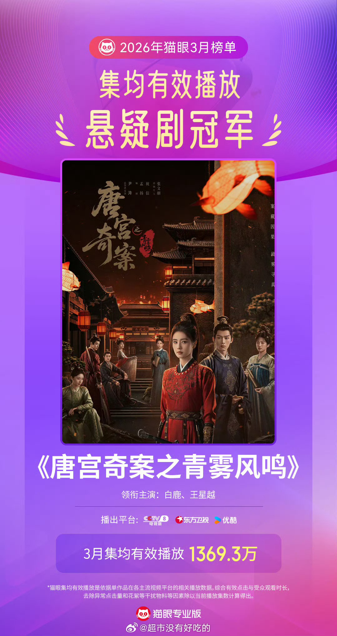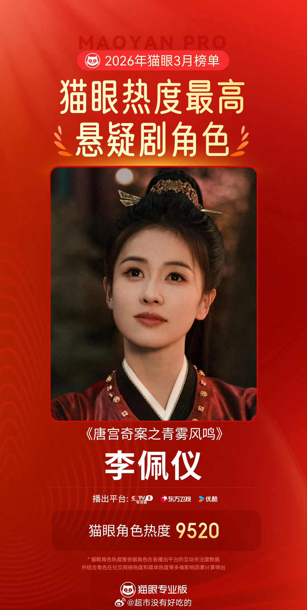 白鹿李佩仪拿下猫眼3月最热悬疑剧角色冠军同时唐宫奇案也拿下3月悬疑剧有效双榜冠军恭喜白鹿白鹿白鹿