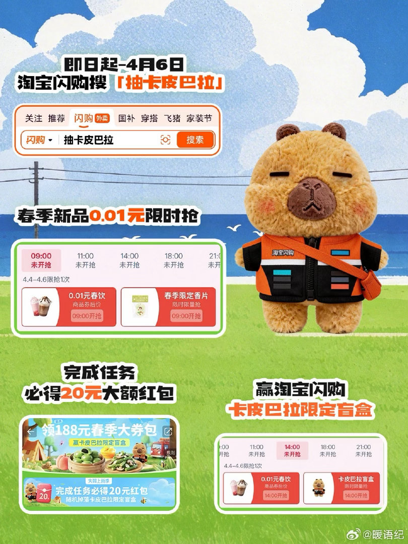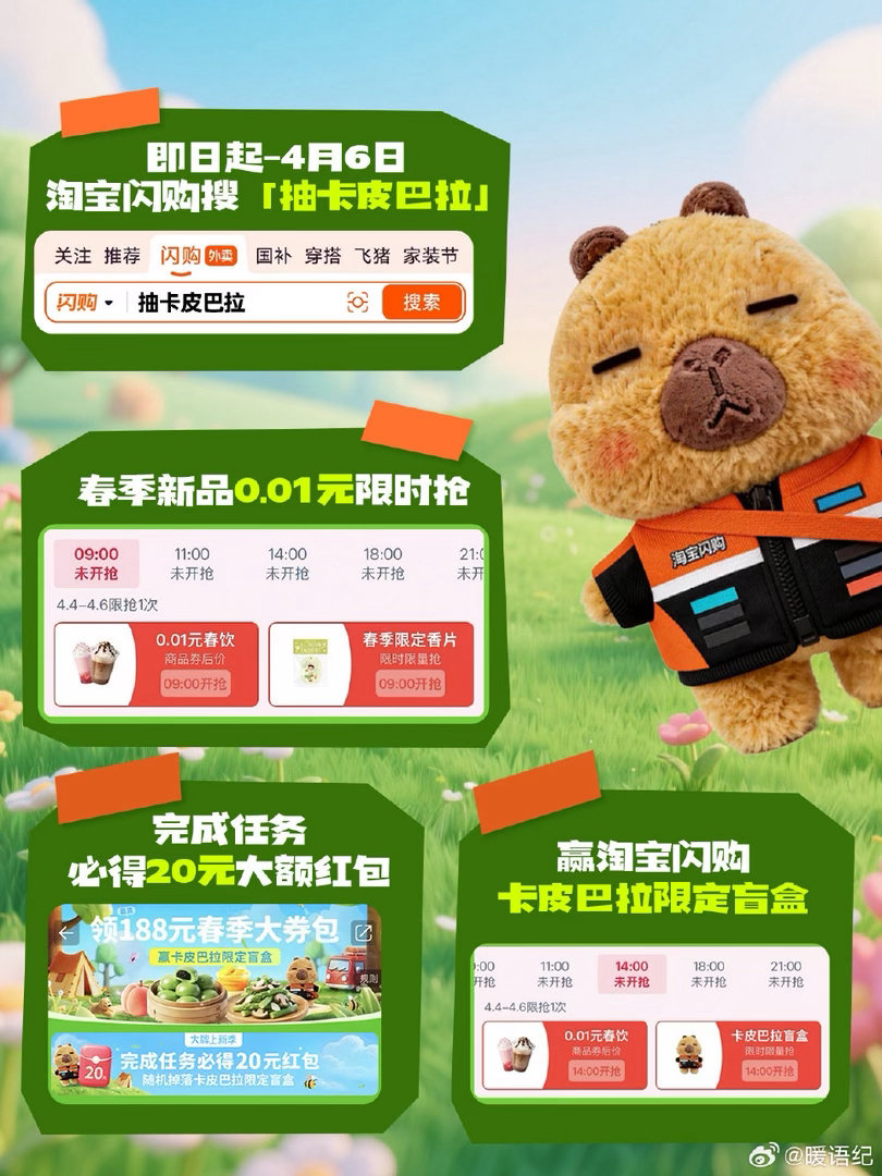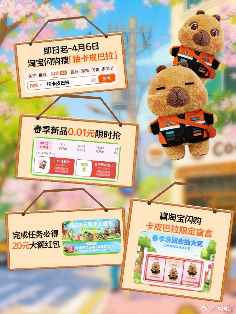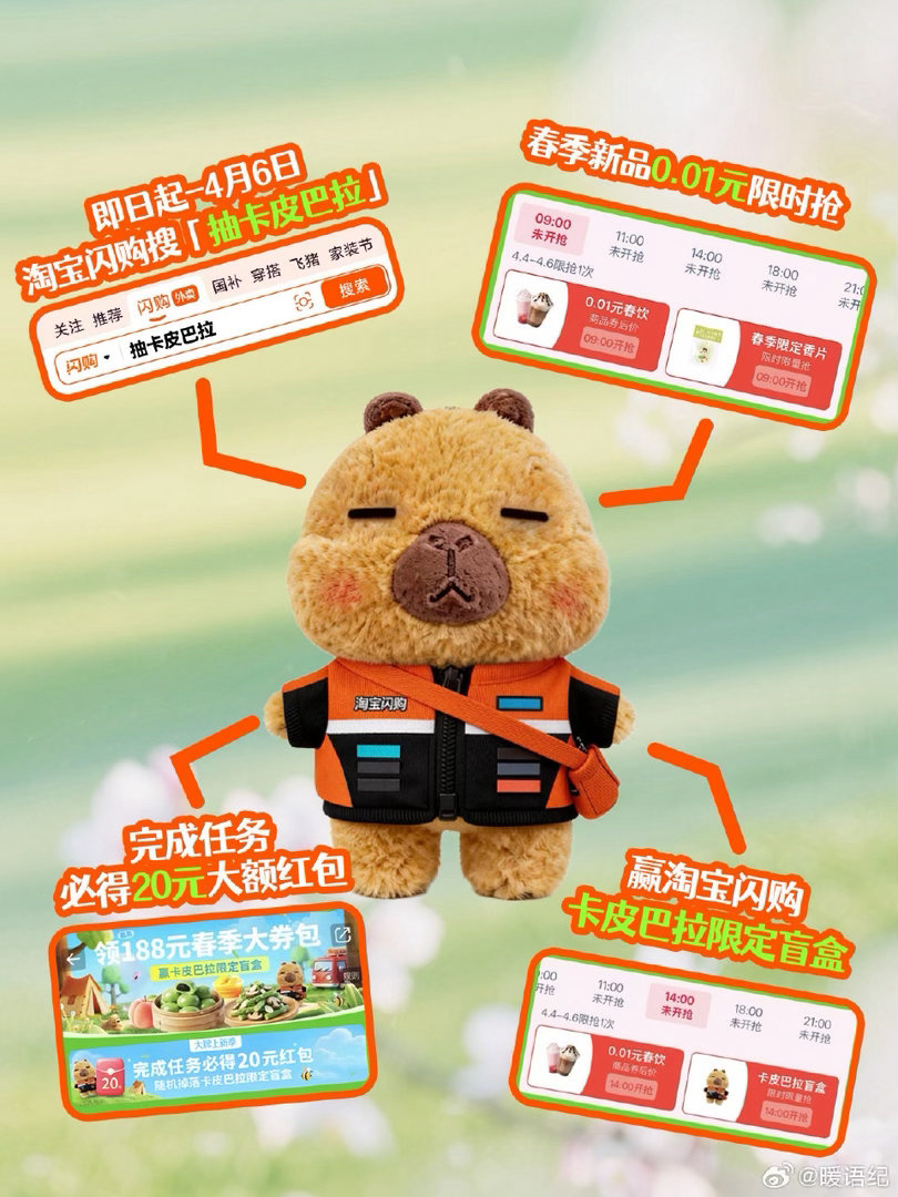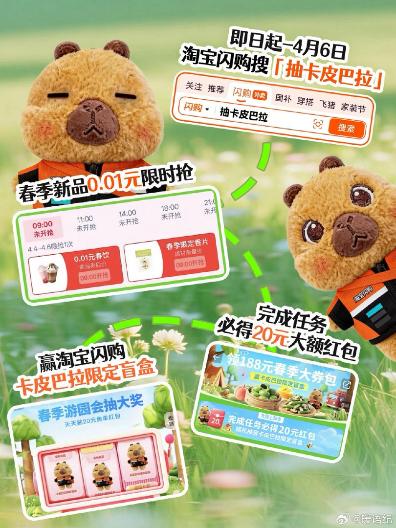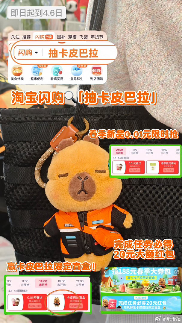 春天第一份软萌暴击来啦🍃 淘宝闪购0.01元抢春季新品,还能把超萌骑士服卡皮巴拉抱回家!即日起至4月6日,搜「抽卡皮巴拉」完成任务,必得20元大额红包,更有机会抽限定盲盒🎁 这波福利不冲等啥?手慢无哦~我的清明假期belike淘宝闪购李现邀你抢春天第一口鲜淘宝闪购大牌上新季淘宝闪购