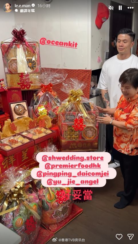 李绮雯做足传统仪式从李绮雯昨日(4日)在IG限时动态公开的过大礼照片及影片可见,传统仪式一应俱全,当中一座“金玉满堂”大金器尤为抢眼。桌上摆满各式传统礼品,包括大块名贵海味、一整排花胶、多盒中式嫁喜礼饼,还有数十个红金包装、堆成小山的过大礼礼篮,喜气十足。李绮雯与未婚夫Ocean站在堆积如山的聘礼后合照,几乎被礼品挡住。