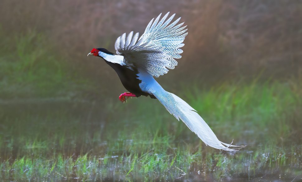 它的翅膀张开像云朵,长尾飘逸得像纱,背景绿莹莹的,整个画面像仙境一样,太震撼啦,仿佛能感受到它飞翔时的自由~