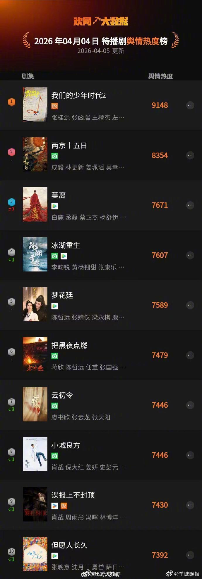 【#我们的少年时代2少年锋芒初露#】少年意气,锋芒尽显;目光如炬,步履坚定;以热血赴约,以实力登场。据欢网大数据发布4月4日待播剧舆情热度表现:由主演的#我们的少年时代2#再次登顶待播剧舆情热度TOP1!敬请期待,见证少年们的闪耀时刻!(现代快报)戳更多>>#撒贝宁 章子怡##浪姐今日直播暂停##陈都灵曾舜晞 戏份##唐艺昕回应阚清子##鞠婧祎田嘉瑞吻戏##浪姐美帝#(编辑:郑宗敏;审签:艾渝)