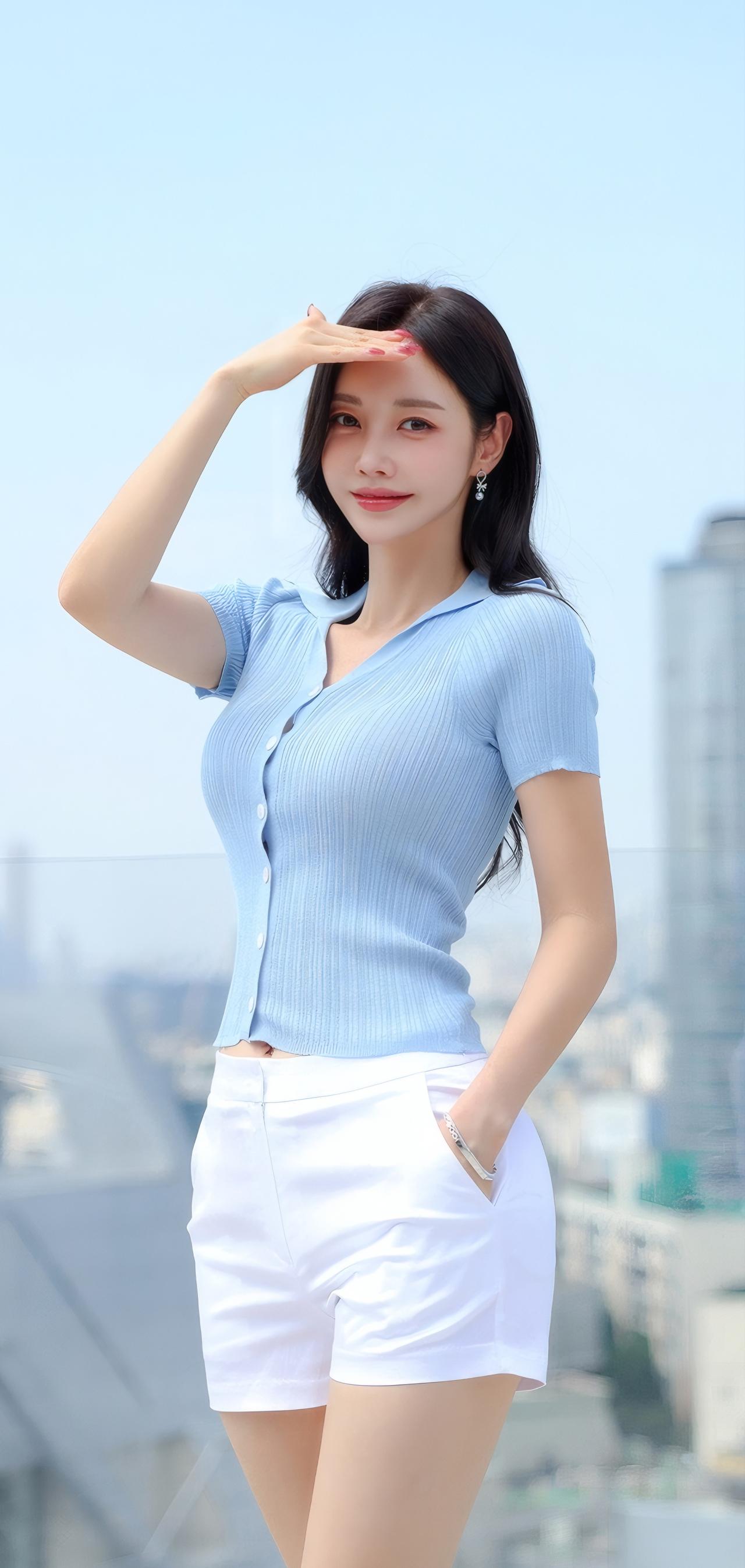 都市少女风,蓝白搭配,时尚穿搭,城市天际线背景,清新自然。