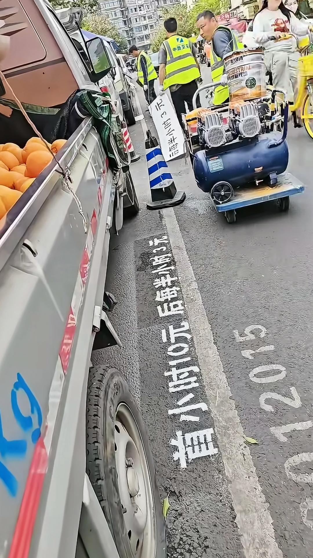 “首小时10元,后每半小时3元”,工作人员在马路边喷上了具体停车收费价格。我想问