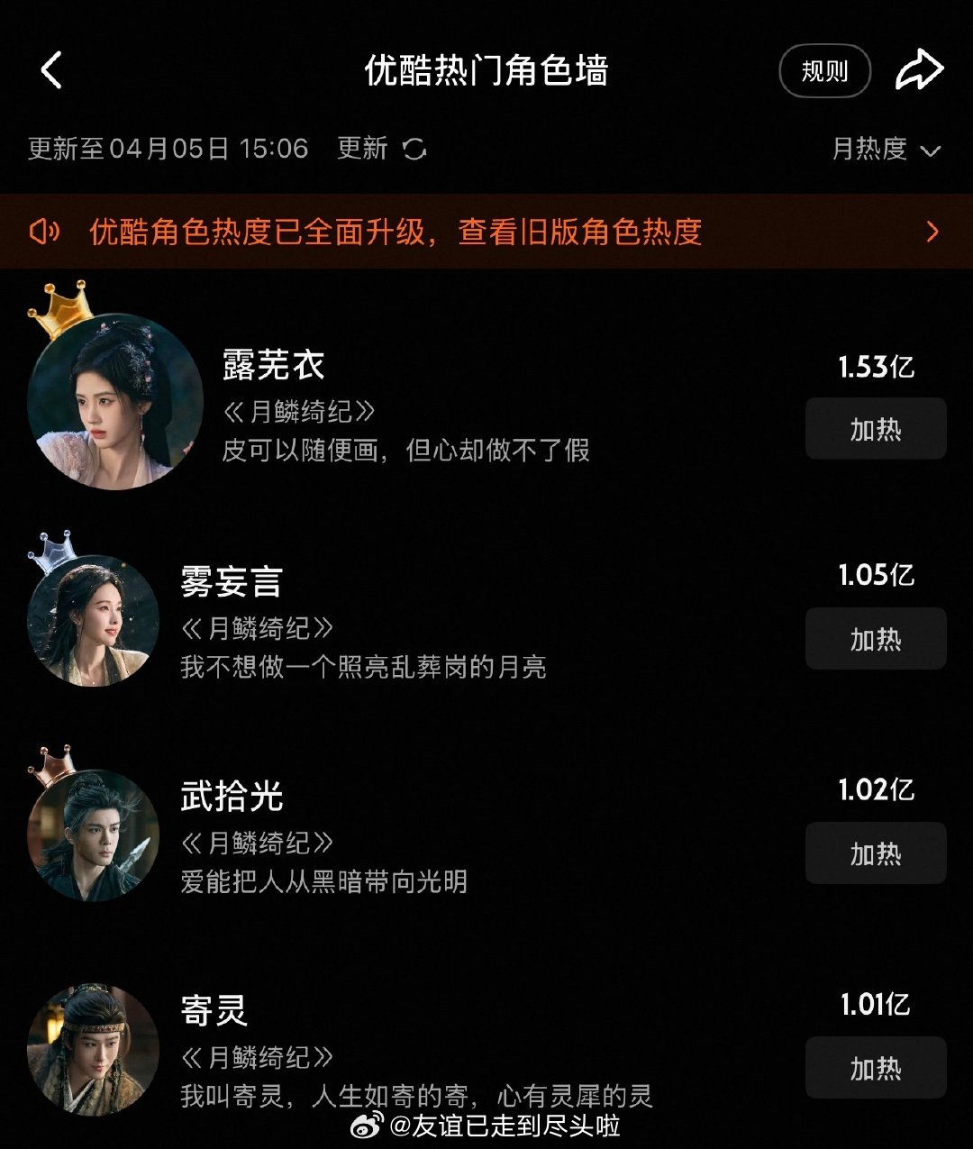 鞠婧祎、曾舜晞、陈都灵、田嘉瑞角色热度均破亿:露芜衣1.53亿、雾妄言1.05亿、武拾光1.02亿、寄灵1.01亿 月鳞绮纪