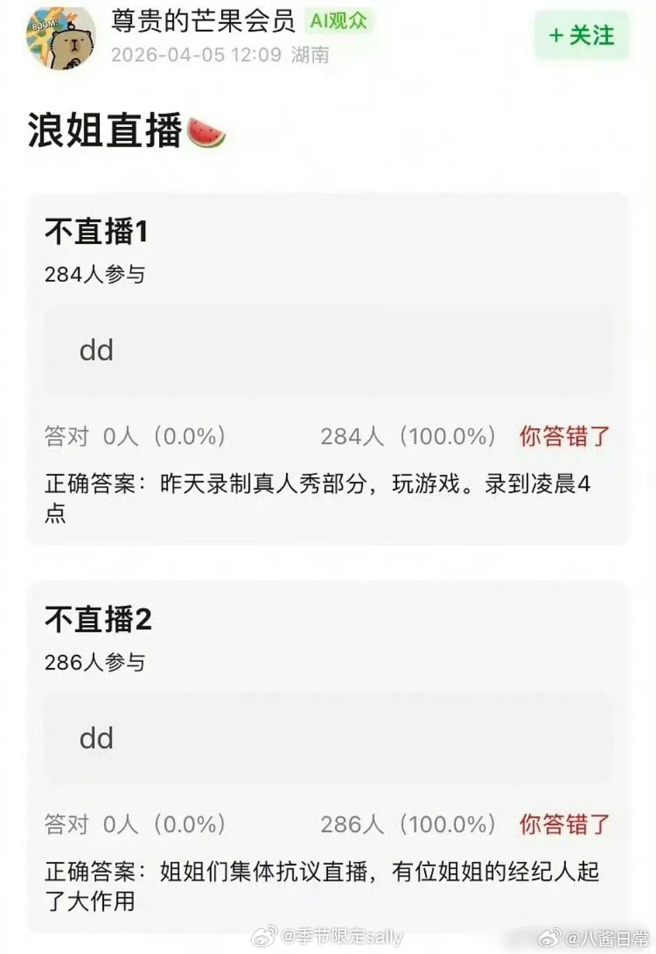 曝浪姐真人秀录到凌晨4点瓜主曝浪姐真人秀录到凌晨4点,今天中午没直播是因为姐姐们集体抗议