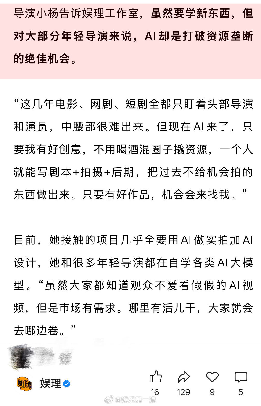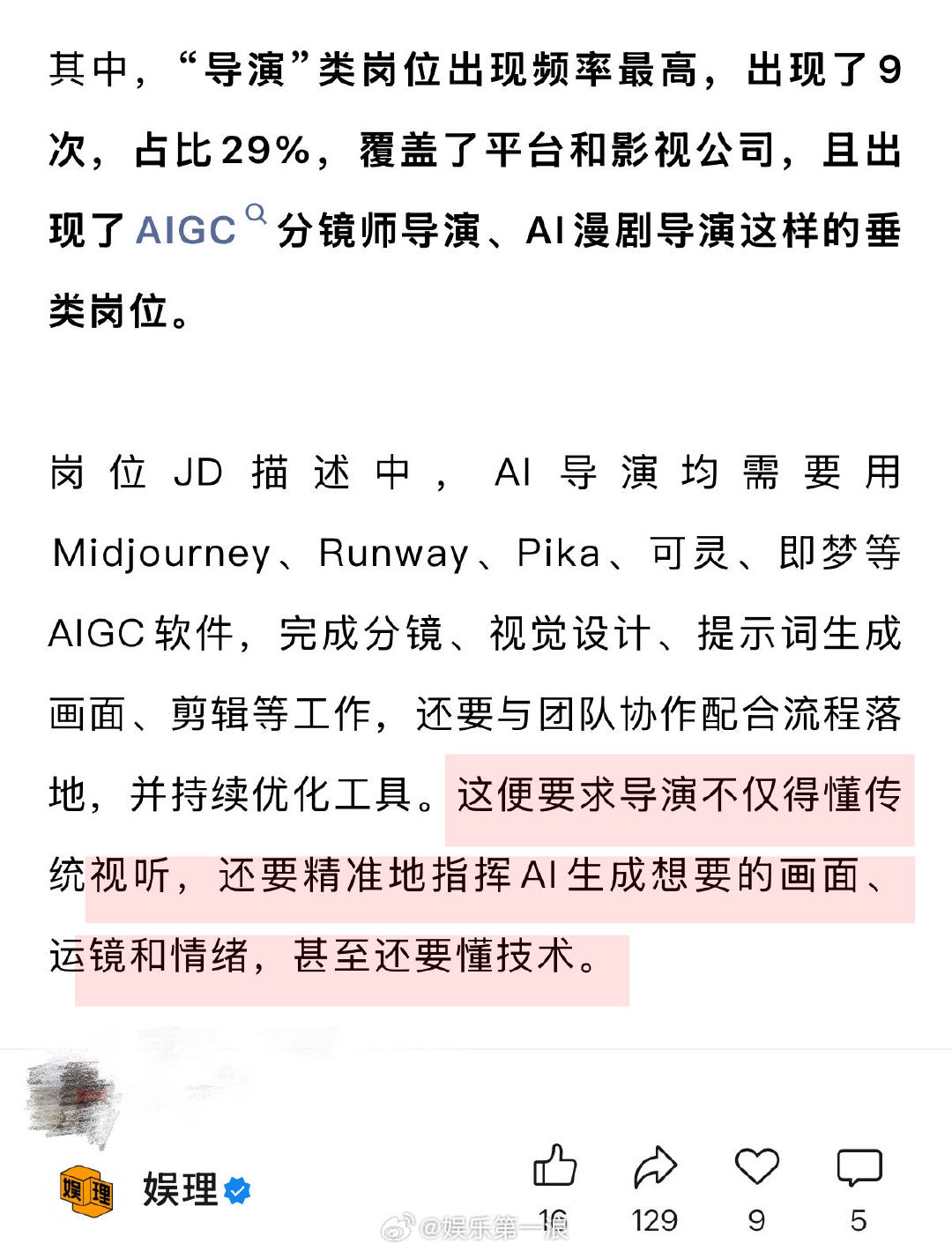 AI导演成2026最火影视岗位 近八成企业要求员工AI能力 上海戏剧学院电影学院院长厉震林认为,随着将来的进阶发展,AI就像手中的笔,借助它,人人都可以写剧本拍电影。“导演不再称为导演,更接近于AI指令师的概念。”他强调,文艺界的重点竞争仍然是创意,,演员中心制或将慢慢变成剧本中心制。AI不会取代演员,但会有部分是AI生成的…