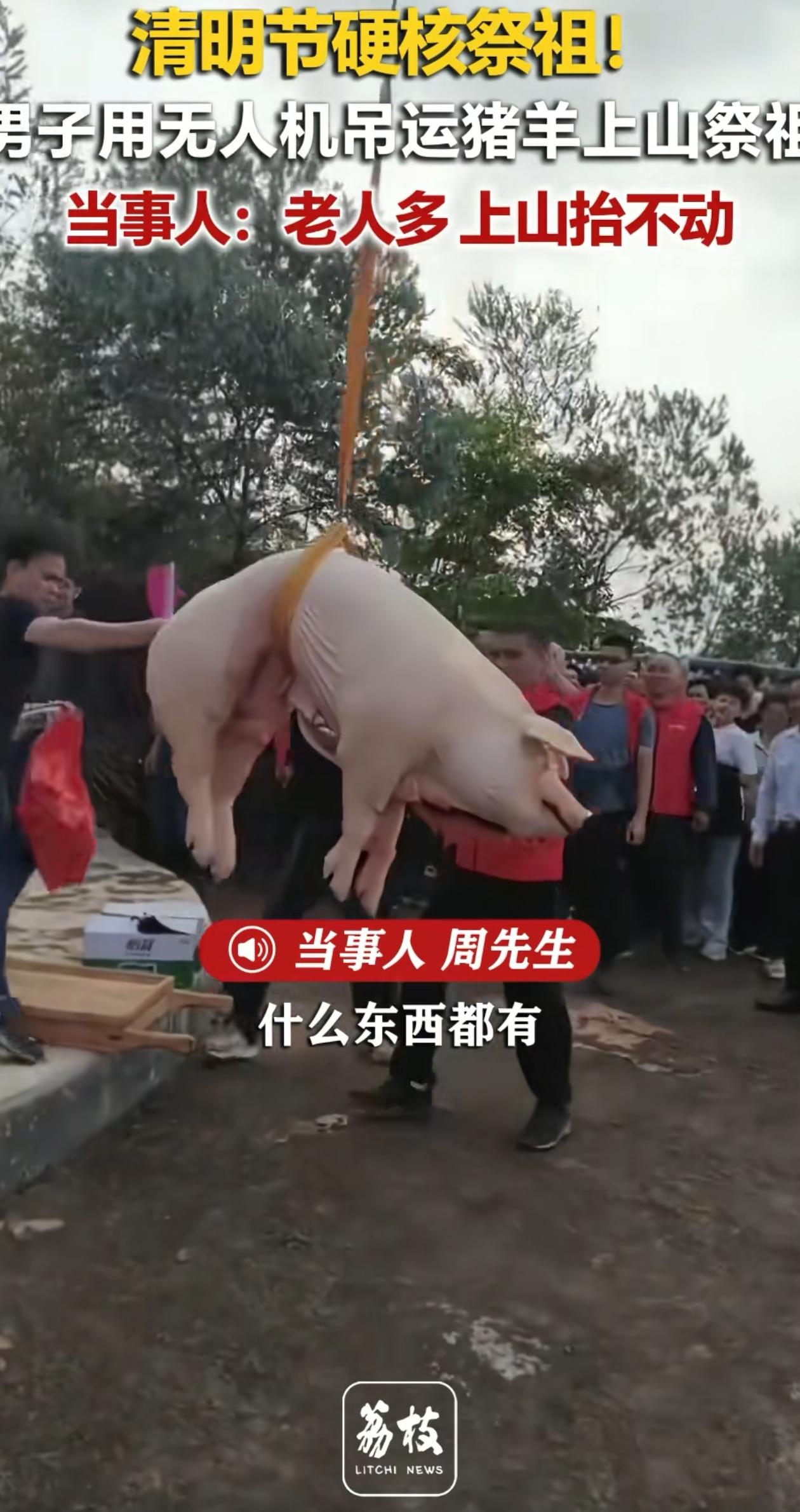猪都没想到!广东梅州,男子家族祭祖,有一头几百斤的猪要扛山上去,他怕家里老人扛不动,于是灵机一动,叫来一个无人机,硬是把这头猪从山下吊到了山上! 估计猪也没想到,自己这辈子还能体会到这种待遇。 这家人祭祖可够豪横,又是搬运几百公斤的活猪,又是送羊,又是带纸的。虽说家里人丁兴旺,年轻人不少,可老人偏要亲力亲为,带头上场。 这从山下到山上虽然不算太远,但多少也有2里路,要是让老人们来扛这头猪,扛不扛得动先不说,就算扛完了,也得累个够呛,那就得不偿失了。 所以男子就想了个法子,找来专业的无人机吊运,愣是把这头活猪给送了上去,全程没花几分钟,既省事又方便,大家看着还觉得新鲜。 对于男子想出来的方法,有网友觉得这有点太隆重了,也有网友感叹估计猪都坐上飞机了。 暂且不提无人机这个事情,我就挺纳闷,正常祭祖不都应该用熟猪吗,为什么这家人直接把生猪运上去了? 但该说不说的,这家人确实实力雄厚,光是阵仗就这么大,确实看着挺让人佩服! 你觉得无人机吊运活猪祭祖好不好?
