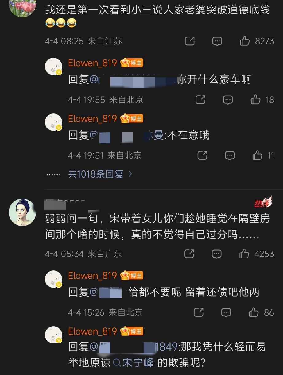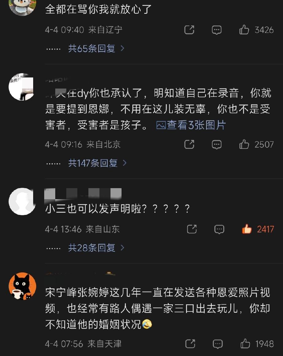 宋宁峰这个小③好嚣张啊。 声明说不知道宋宁峰已婚身份,这是在搞笑吗? 他和宋婉婷每年都就被拍到一家四口出去玩,还上过热搜好几次,这个q女士还是圈内人,怎么可能不知道? 而且,她一个第三者,居然说原配突破道德底线,「低声下气恳求她」 不知道的,还以为宋婉婷才是☂呢![捂脸] 录音里还故意爆出来,自己和宋宁峰在船上时,张婉婷闺女就在旁边屋。 真的是太奇葩了! 高露如果这都不开除,估计路人缘也会受到影响。