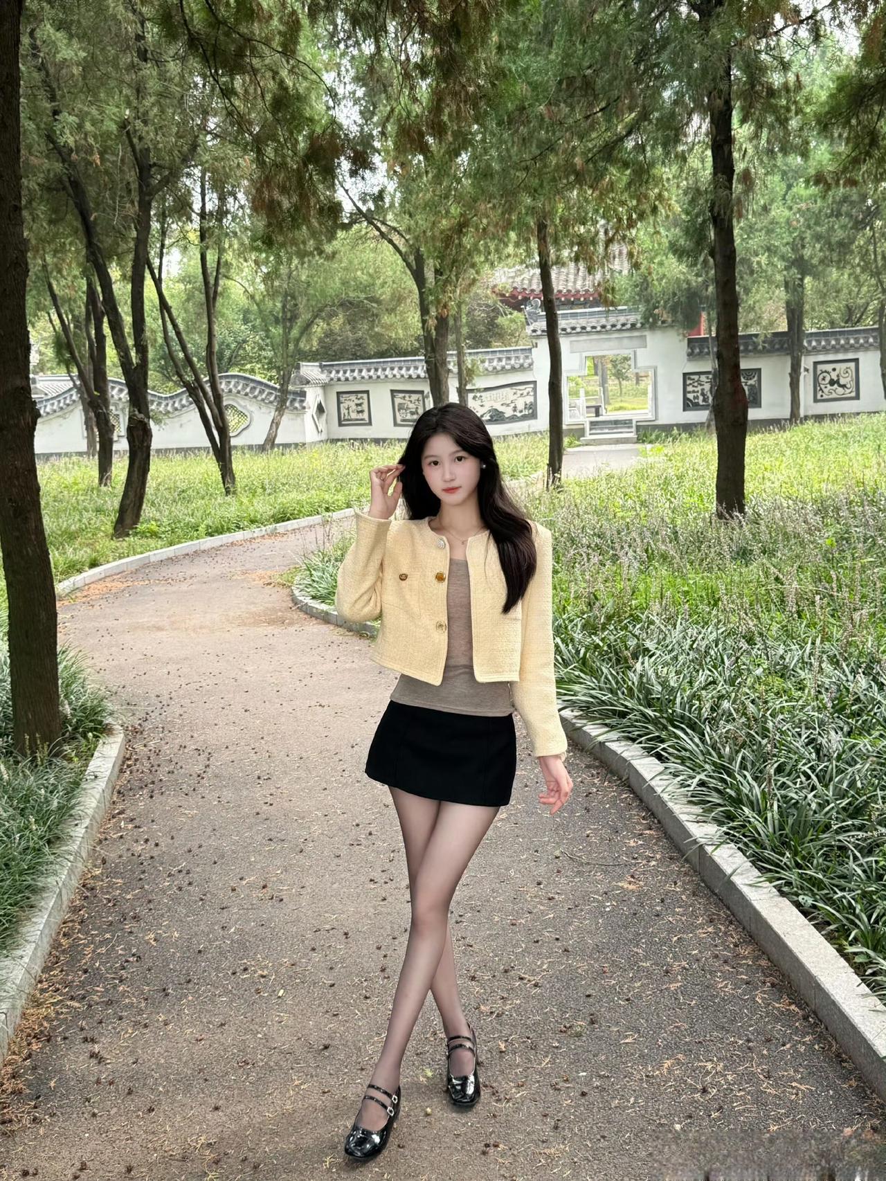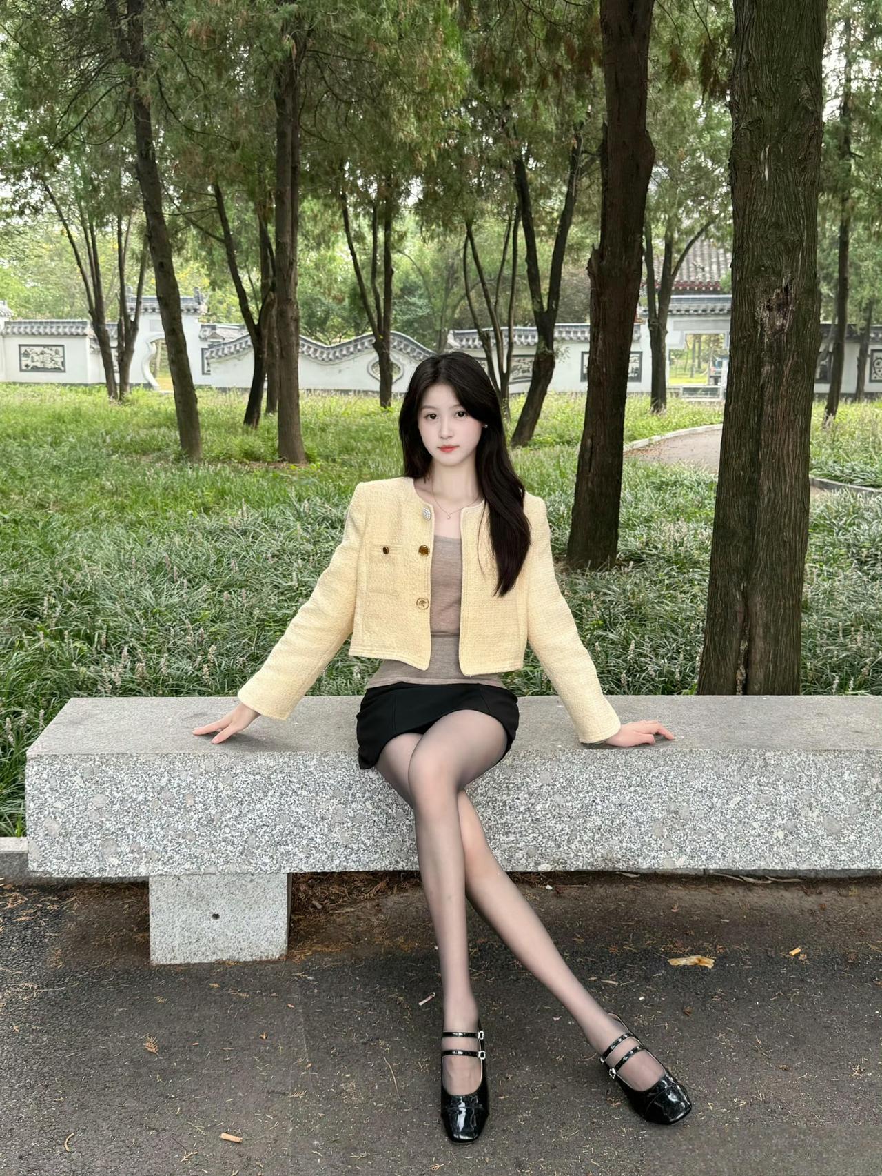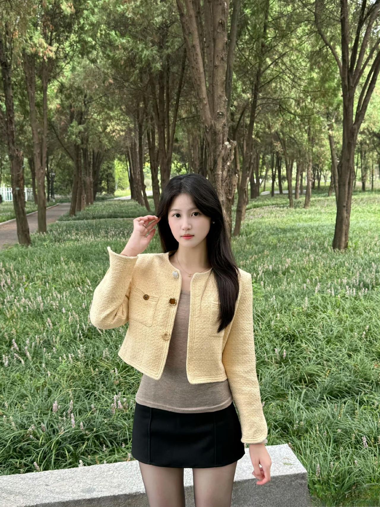 这套穿搭是温柔优雅的“小香风+轻甜”组合,很适配户外休闲场景: - 上衣选了鹅黄色短款小香风外套,编织纹理+金属扣细节自带精致感,短款版型还能优化身材比例;内搭浅棕吊带,柔和色调和外套呼应,增加了层次感; - 下装搭黑色短款A字裙,简约版型中和了小香风的华丽感,显瘦又利落; - 鞋子用黑色玛丽珍鞋,复古鞋型和小香风适配度很高。 这种“小香风短外套+简约下装+复古鞋型”的搭配,既能穿出精致感,又不会显得过于正式。高端小香风穿搭