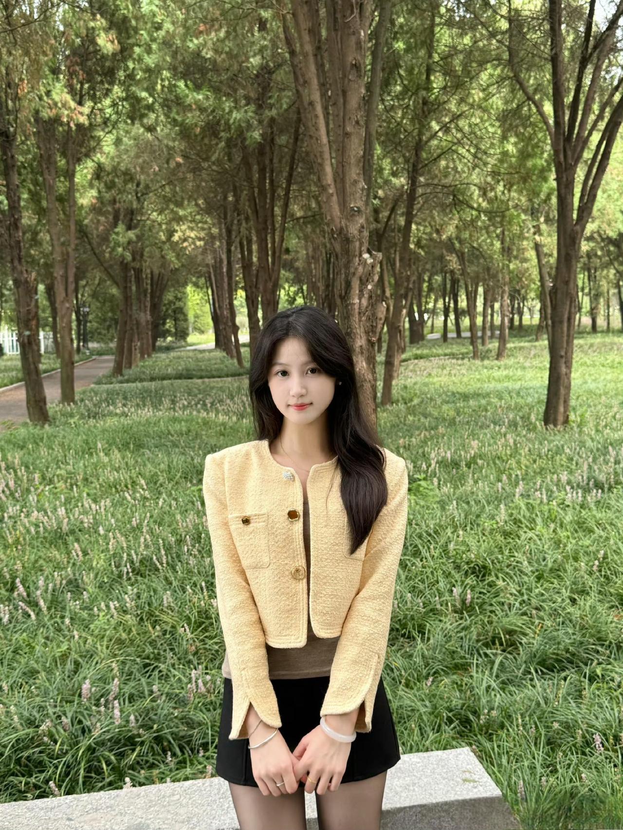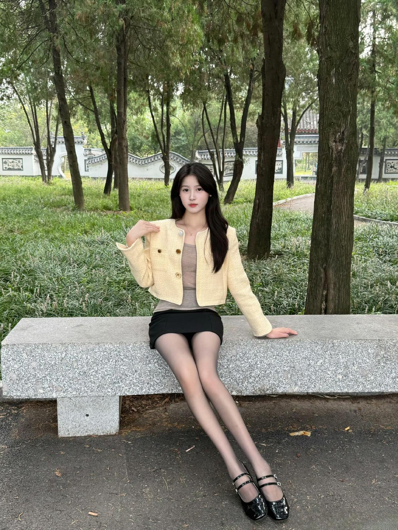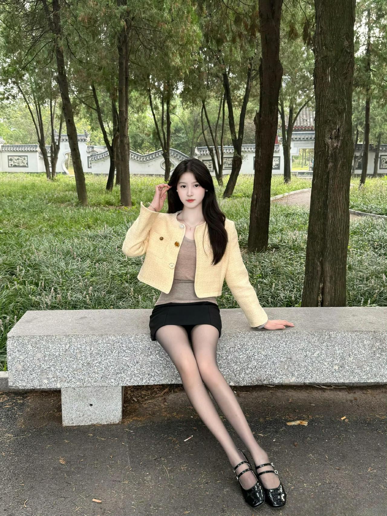 这套穿搭是温柔优雅的“小香风+轻甜”组合,很适配户外休闲场景: - 上衣选了鹅黄色短款小香风外套,编织纹理+金属扣细节自带精致感,短款版型还能优化身材比例;内搭浅棕吊带,柔和色调和外套呼应,增加了层次感; - 下装搭黑色短款A字裙,简约版型中和了小香风的华丽感,显瘦又利落; - 鞋子用黑色玛丽珍鞋,复古鞋型和小香风适配度很高。 这种“小香风短外套+简约下装+复古鞋型”的搭配,既能穿出精致感,又不会显得过于正式。高端小香风穿搭