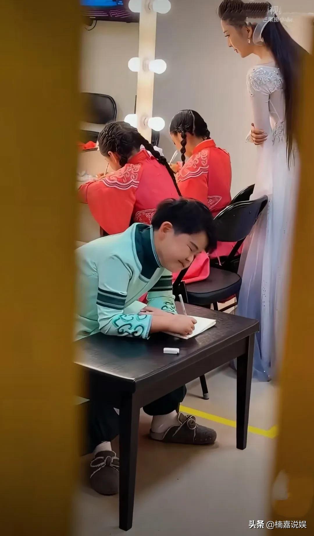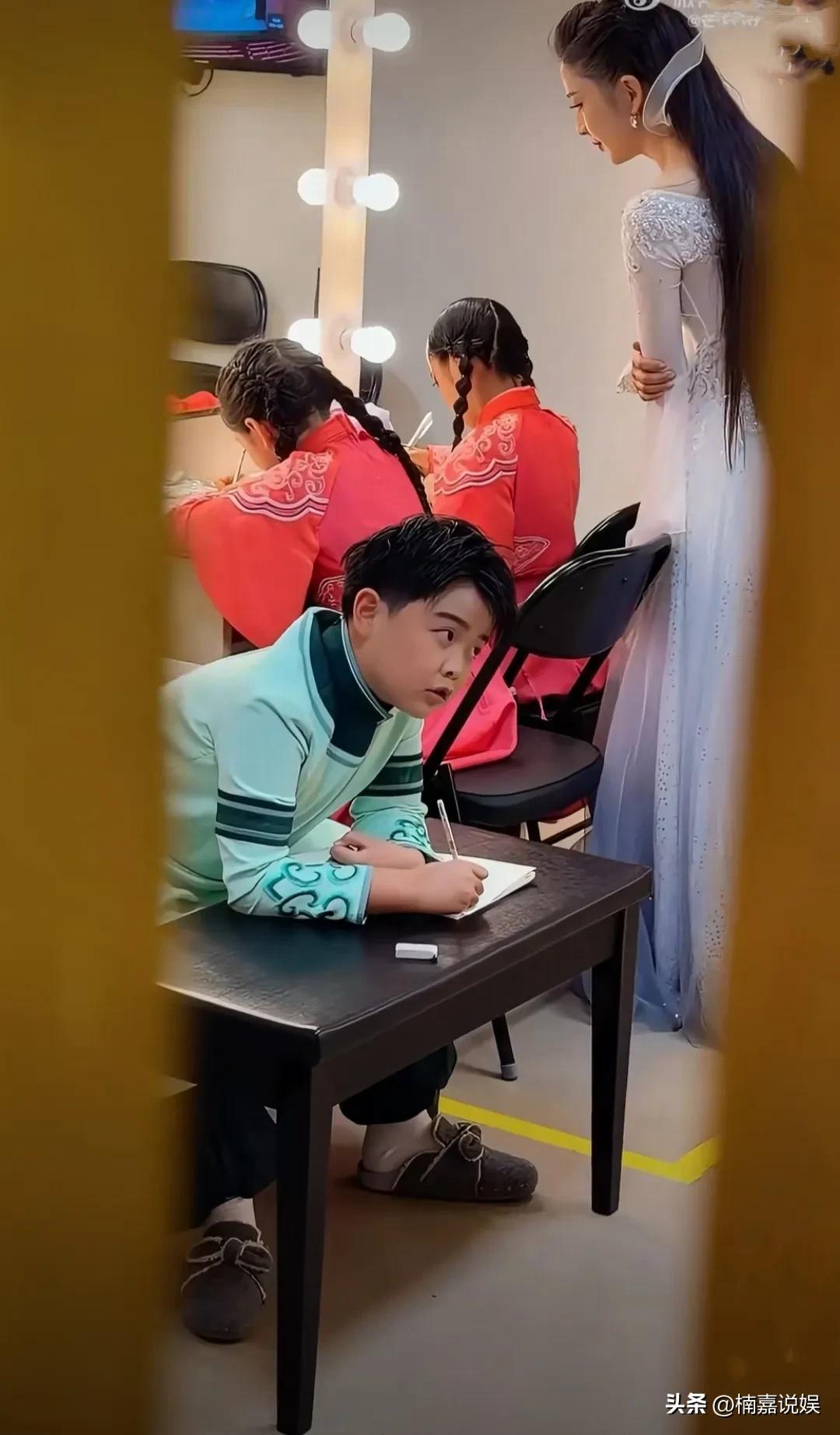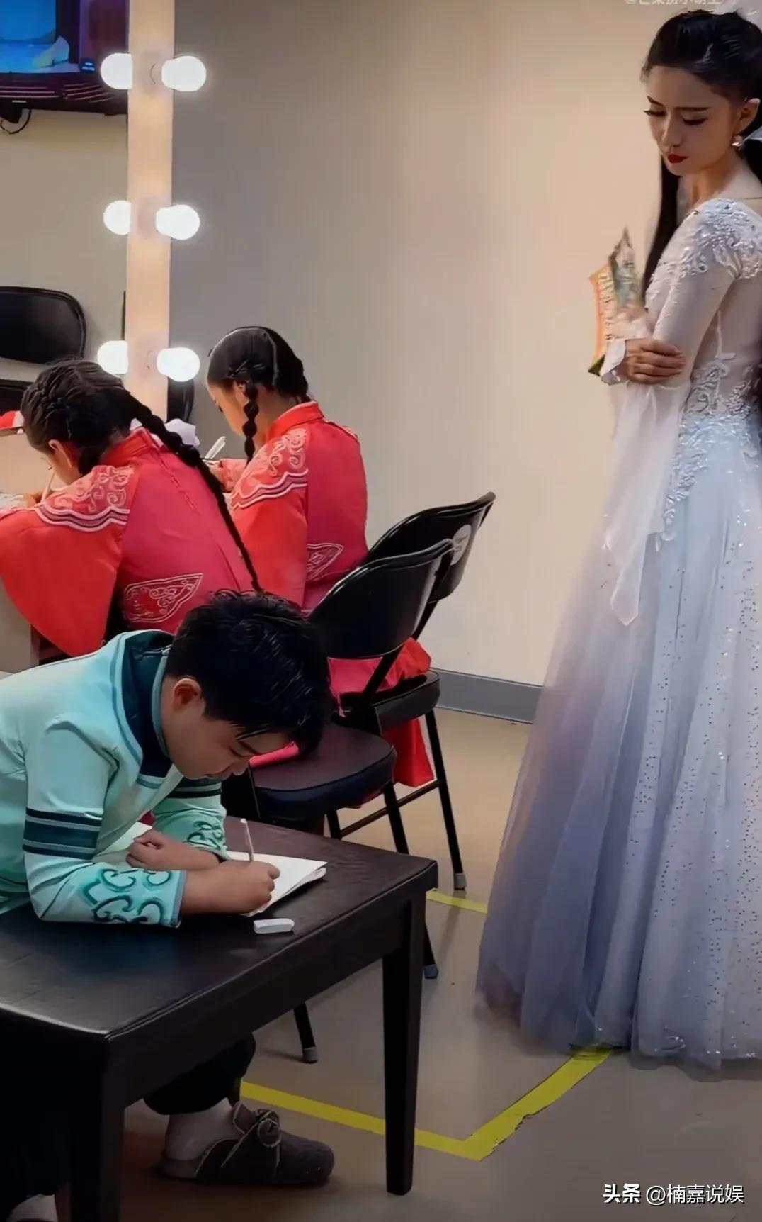 这一幕真有趣,佟丽娅在后台督促孩子们学习,帮孩子们听写,这是对孩子们的学习和爱好一起抓啊! 佟丽娅带着两个孩子,小酒窝和朵朵,一起出演舞蹈剧《在远方·在这里》,虽然孩子们很努力的演出,但是学习也不能落下。 佟丽娅穿着纱裙,小酒窝和朵朵都穿着演出服。佟丽娅拿着小册子,认真的督促孩子们听写,看朵朵抓腮挠耳的样子,真有点好笑,难道要听写的内容很难?[捂脸]