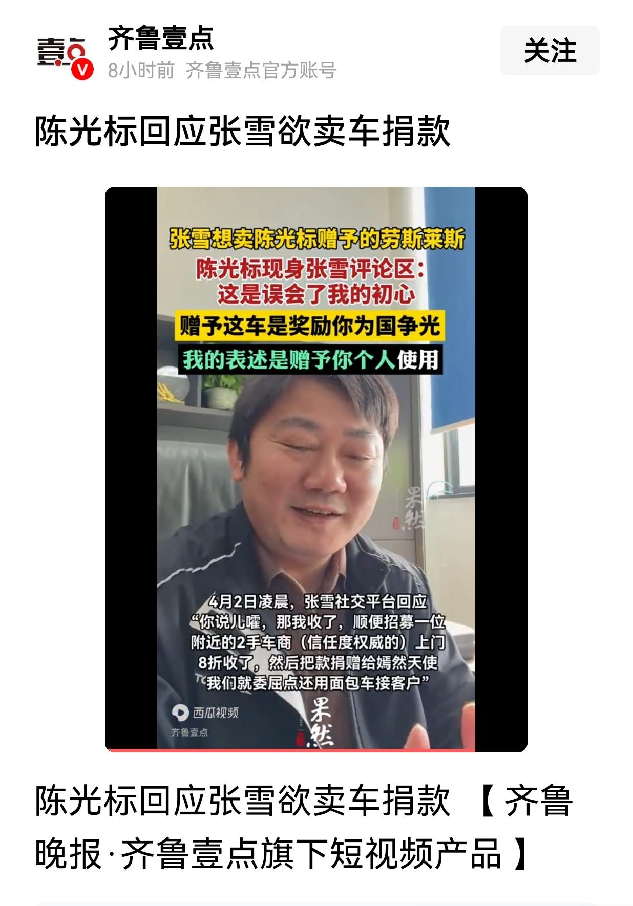 谁都可以相信,张雪需要的不是“慈善”;更不需要陈光标以“慈善”为名的价值1300万的加长劳斯莱斯幻影。 而且张雪也已经公开声明将卖掉陈光标赠予的车,并全部捐款给嫣然基金,而“继续用面包车接送客户”! 其实,多一些坦诚更好!