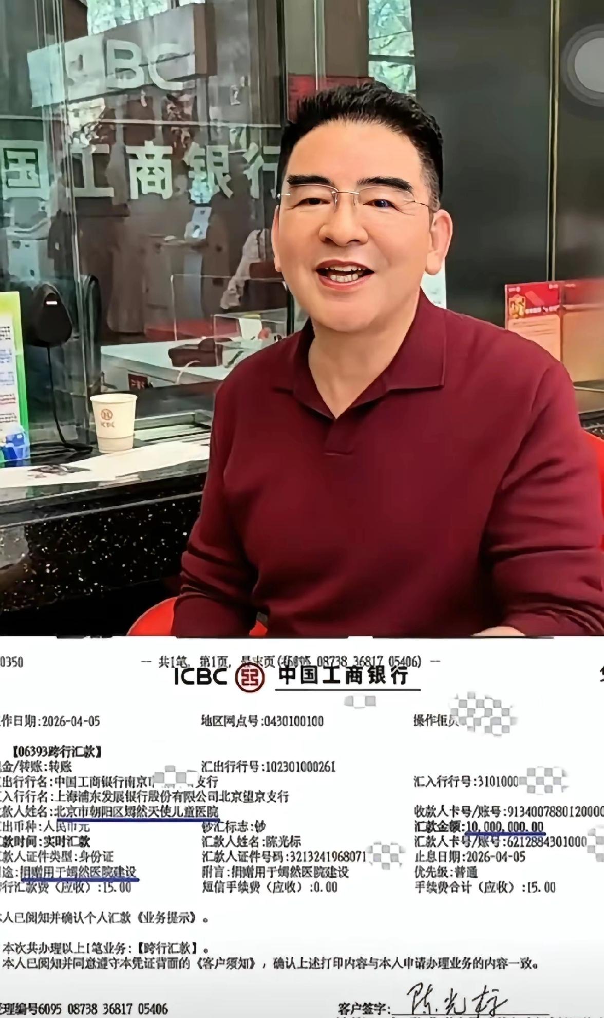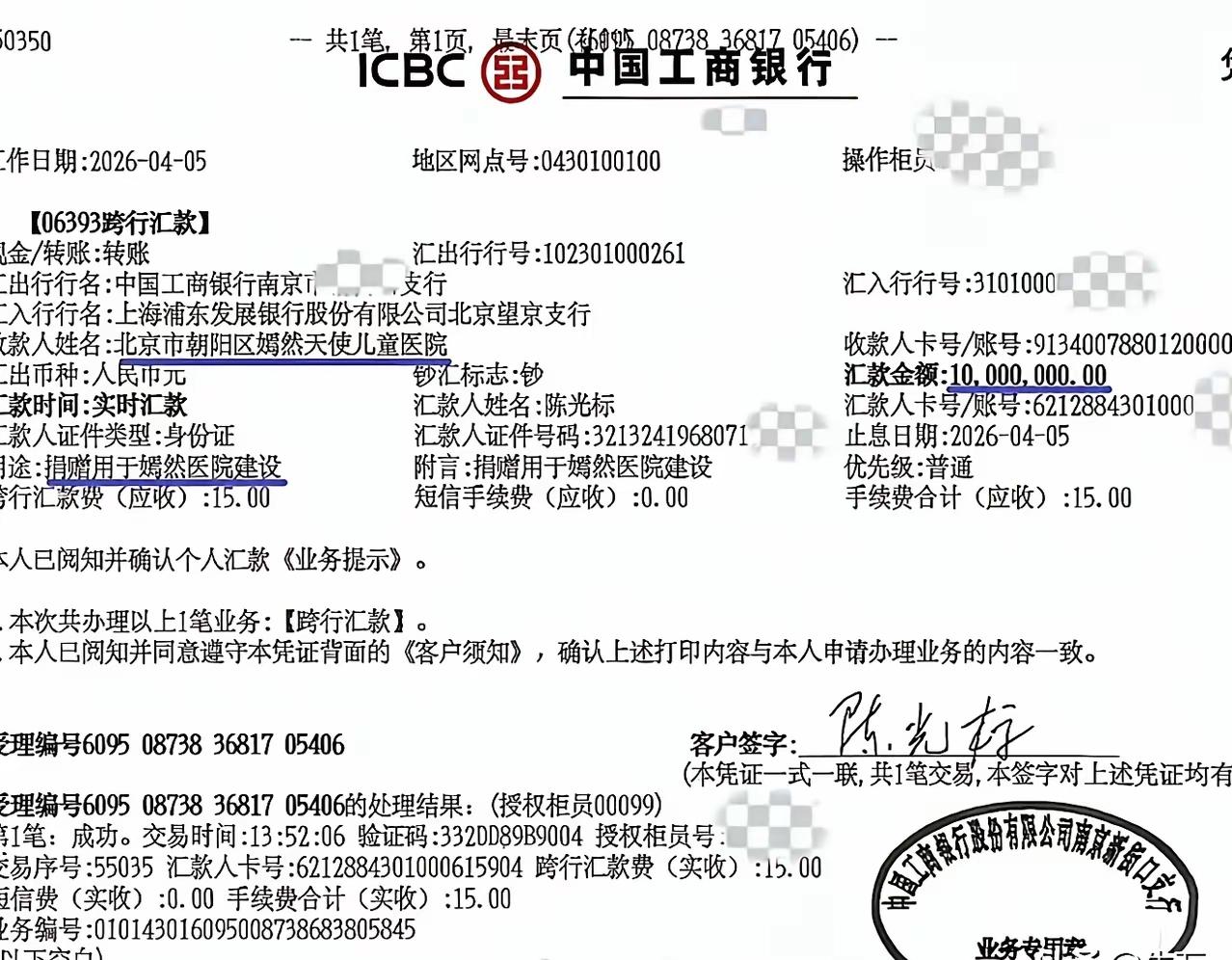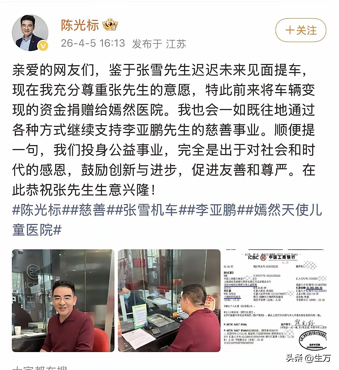 陈光标真的真男人啊!他已经把车辆变现折合成人民币1000万捐给了嫣然天使基金,他还拍了自己到银行汇款的画面,还晒了发票。他说鉴于张雪先生未见面提车,现在充分尊重张雪先生的意愿,特此前来将车辆变现的资金捐赠给嫣然医院。我也会一如既往的通过各种方式继续支持李亚鹏先生的慈善事业。顺便提起,我们投身公益事业完全是出于对社会责任和对时代的感恩。 之前张雪对陈光标捐车的态度半信半疑,也一直没有真诚热心的回应。而昨晚李亚鹏在直播间里调侃陈光标,说他说的话不值得信,今天陈光标就捐了1000万,可以说是很大度了。但行好事,莫问前程,大家多理解理解他吧。