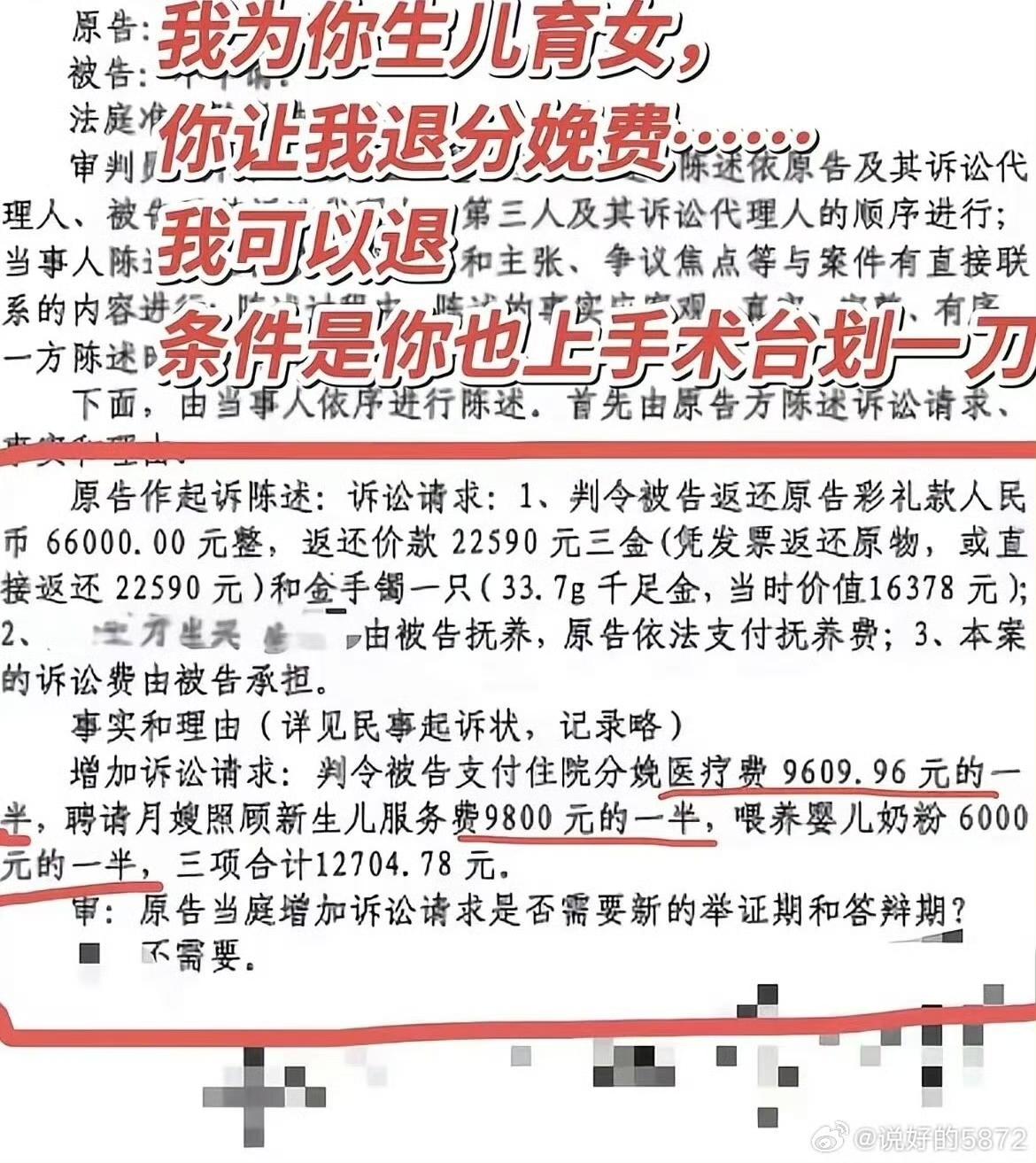 仅退款的风刮到婚姻届,安徽情侣为带孩子分手,告到法院连分娩费用都要均摊,这算计太离谱,女生幸好没和男的领证结婚。 安徽宿松一对情侣恋爱订婚,男方给付彩礼与三金,约定生子后领证。女方顺利怀孕,独自承担多项孕期开支,男方态度冷淡还迟迟不愿登记结婚。后续女方剖腹产诞下孩子,男方垫付部分分娩、月嫂相关费用。不料,男方要女子辞职回家全职带娃,女子不同意。男子父亲更是搬出三从四德这一套。 女子拒绝后,双方爆发激烈矛盾,感情彻底破裂分手。随后男方起诉女方,不仅要求全额退还彩礼三金,还索要分娩费、月嫂费、奶粉钱,引发热议。法院审理后判定:分娩、月嫂相关费用无需退还,生育为双方共同责任,且女方身体遭受创伤,男方索赔违背公序良俗;因二人未领证,最终判决女方返还一半彩礼、三金及相关育儿费用。 此事也让网友感慨,生育付出不该被轻易算计。