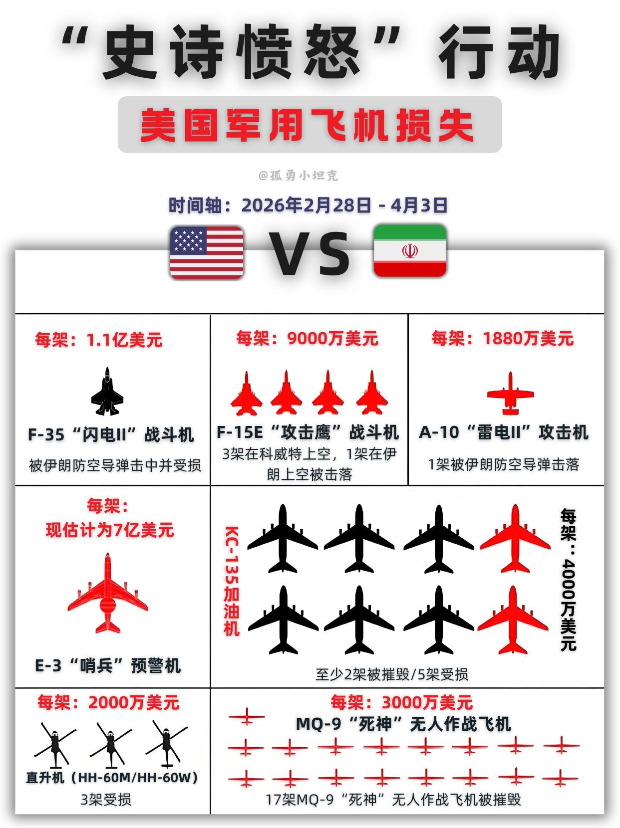 史诗愤怒行动,美军基本每天一架损失惨重! 美伊行动,美军多型军机遭惨重损失。 1、美军主力战机损失触目惊心,1 架 F-35 遭击伤、4 架 F-15E 与 1 架 A-10 被击落,单架 F-35 造价 1.1 亿美元;另有高价值 E-3 预警机、多架 KC-135 加油机受损或被摧毁。 2、辅助机型与无人机损失同样惊人,3 架直升机受损,17 架 MQ-9 死神无人机被全数摧毁,单架无人机造价 3000 万美元,仅无人机损失就超 5 亿美元,整体损失规模惊人。 天价损失难换战果,美军行动终是得不偿失。