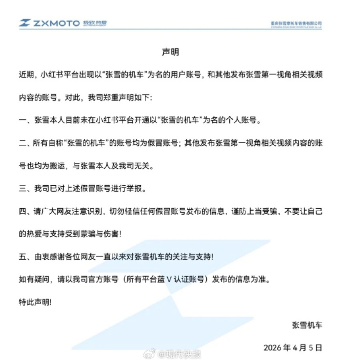 张雪机车严正声明张雪机车官方于4月5日发布严正声明,澄清其创始人张雪未在小红书平台开通任何个人账号,并强调平台唯一官方账号为“张雪机车”,其他同名或发布其第一视角视频的账号均系假冒,呼吁用户警惕诈骗风险。张雪机车打假冒充账号张雪机车