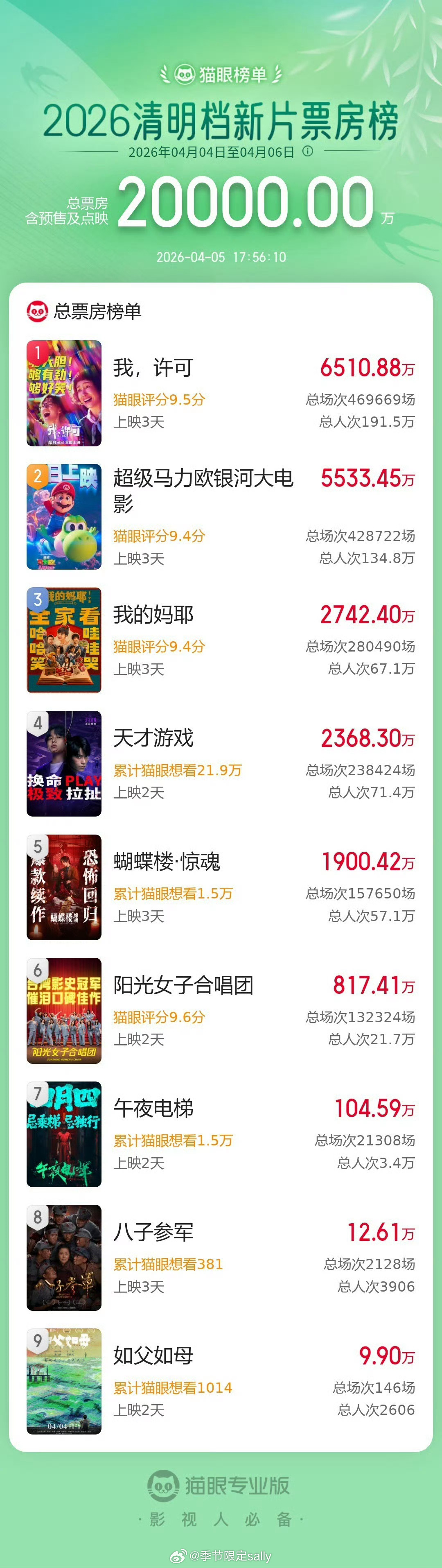 2026年清明档新片总票房破2亿,《我,许可》《超级马力欧银河大电影》《我的妈耶