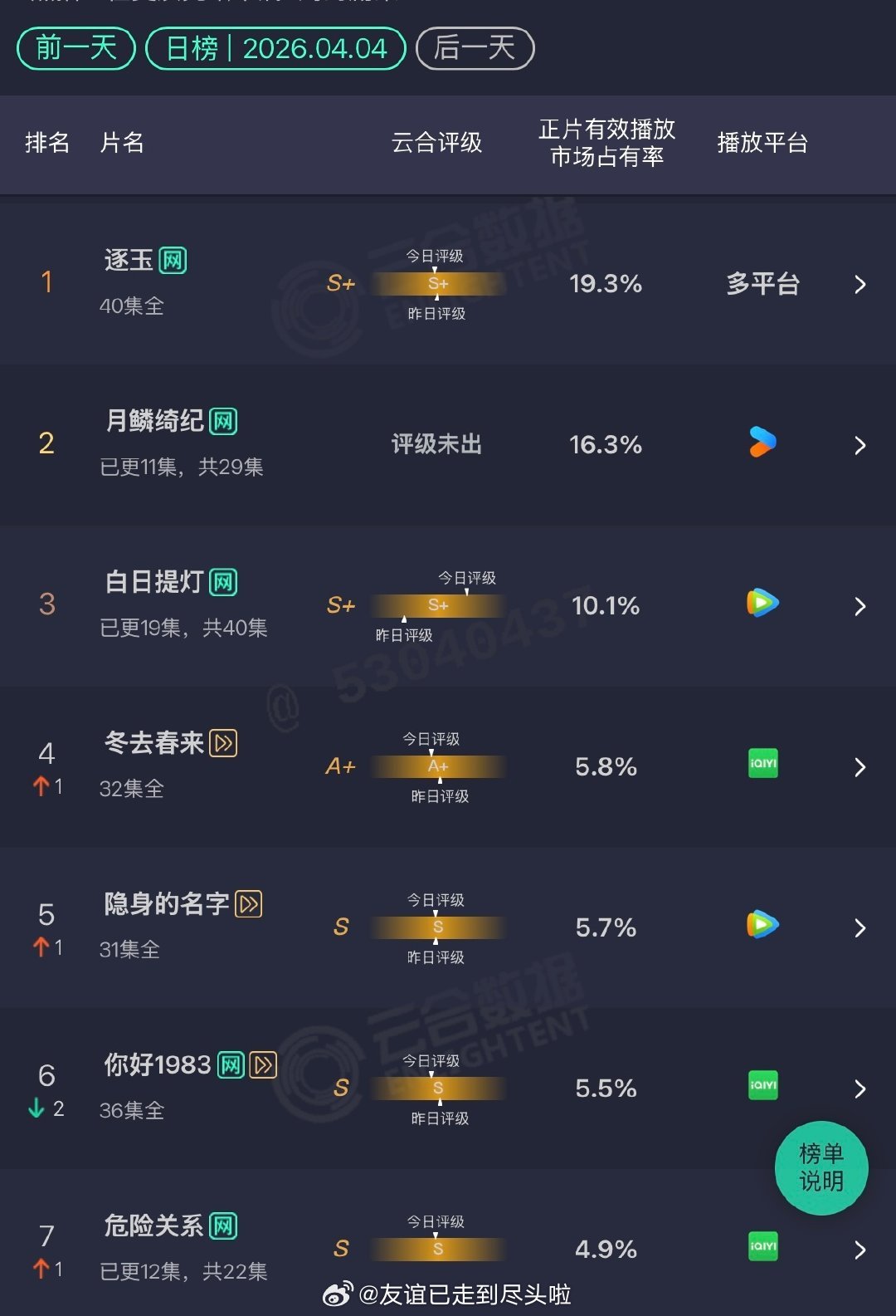 4.4云合张凌赫、田曦薇的《逐玉》19.3% ,收官5天了还能第一鞠婧祎、曾舜晞、陈都灵、田嘉瑞的月鳞绮纪16.3% ,预估3800+,马上冲第一了迪丽热巴、陈飞宇白日提灯10.1%