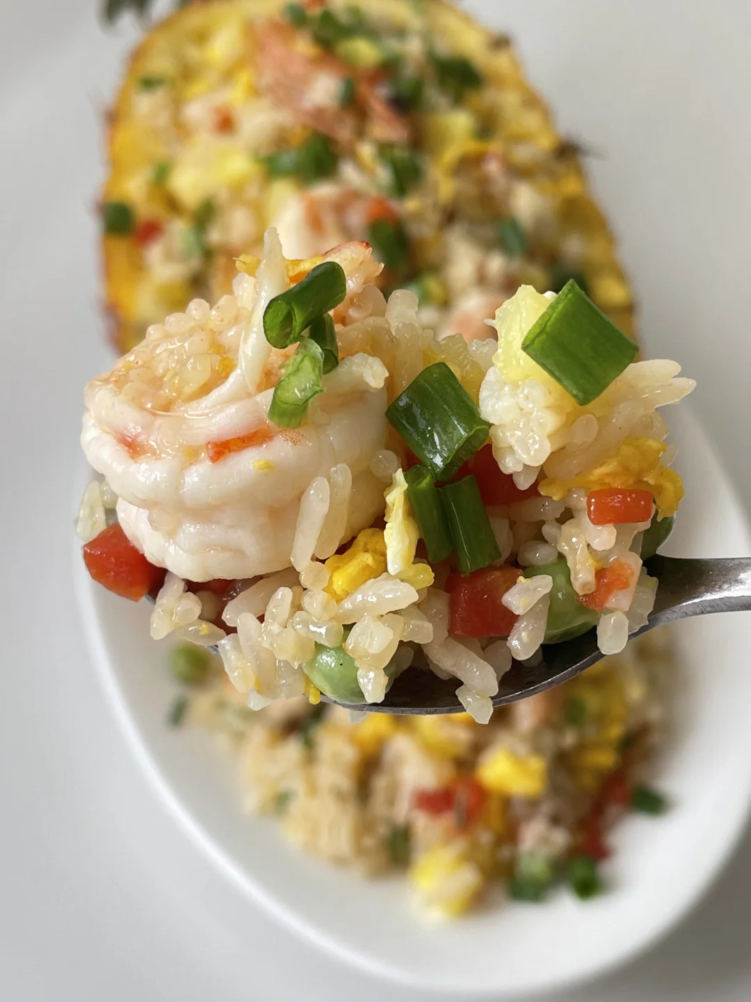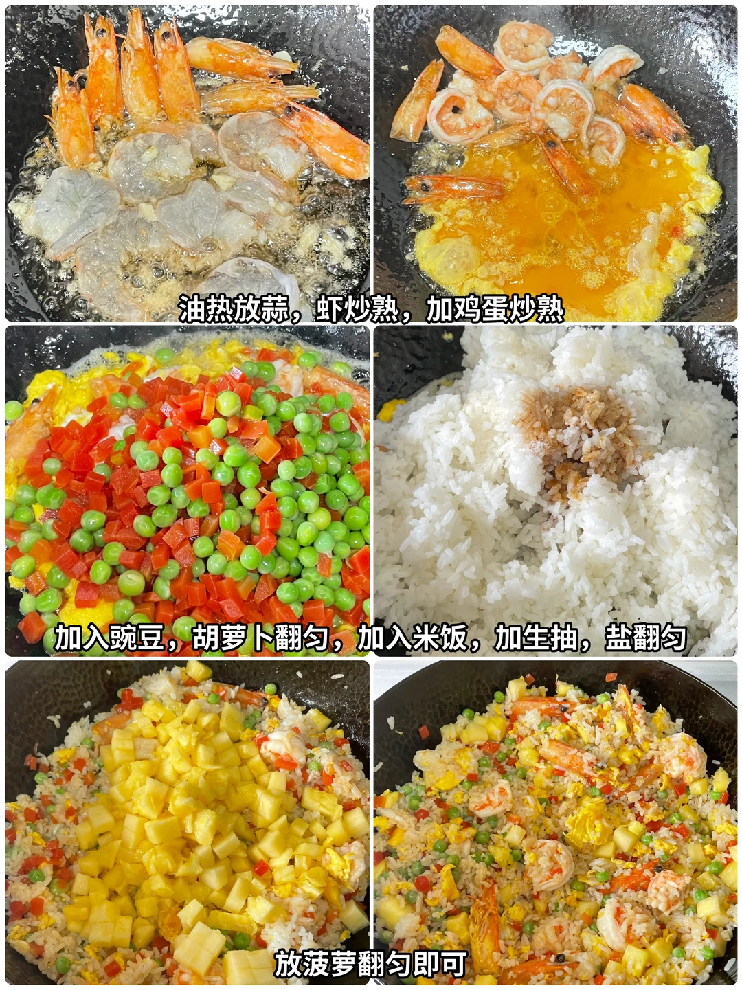 这盘菠萝炒饭,是视觉与味觉的双重盛宴。米粒与酸甜菠萝丁、鲜嫩虾仁、青豆共舞。一勺入口,先是菠萝汁水在舌尖迸开,唤醒味蕾;接着是虾仁的鲜弹,最后米饭带着镬气与果香在齿间缠绵。咸、甜、酸、鲜层次分明又完美融合,仿佛把东南亚的热带风情都浓缩在这一盘里,清爽不腻,让人一勺接一勺,根本停不下来。 👩‍🍳:做法如下⬇️ 锅中放冷水,加一点盐一点油,将豌豆粒、胡萝卜粒下锅煮5分钟,盛出备用。 虾仁放一点胡椒粉,盐你淀粉抓匀腌制10分钟。 起锅烧油,油热将虾头炒出虾油,再放入蒜末加入虾仁炒熟,倒入鸡蛋炒熟,加入豌豆、胡萝卜翻匀,继续加入米饭,加一点生抽和盐翻匀,最后再放入菠萝和葱花拌匀即可出锅。这样做出来的菠萝炒饭真的巨好吃。