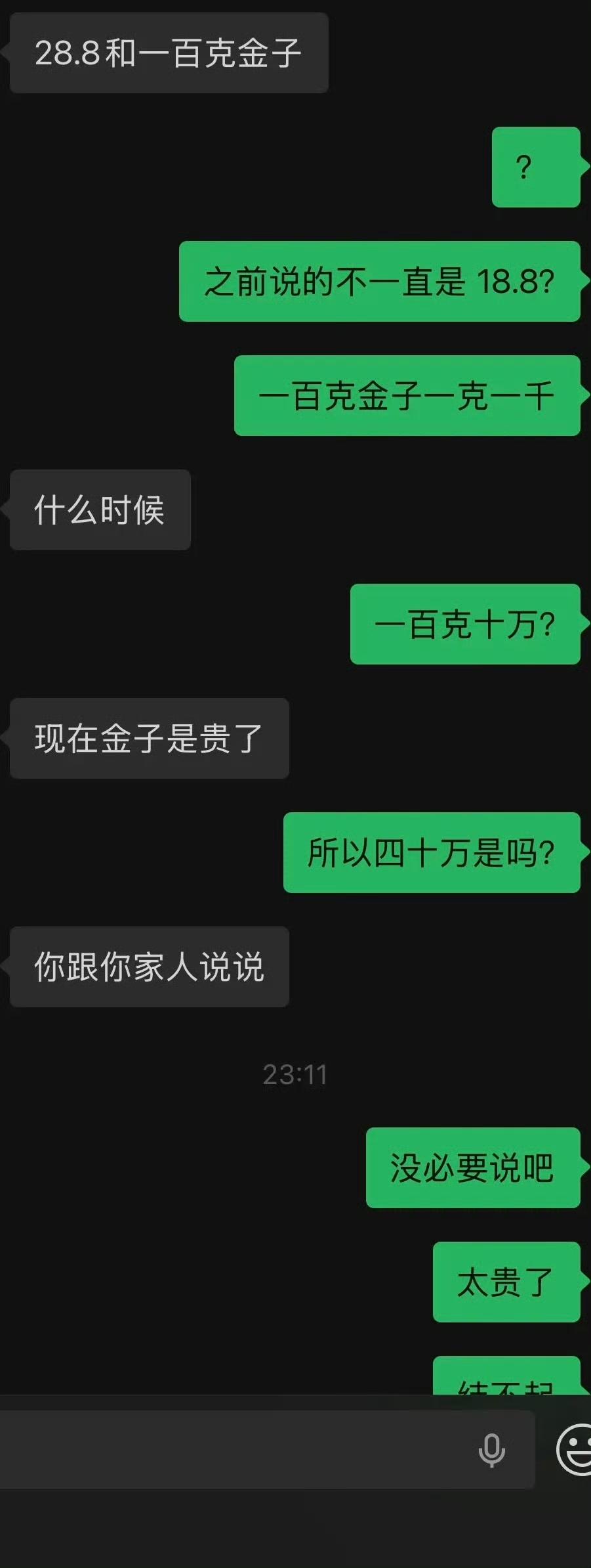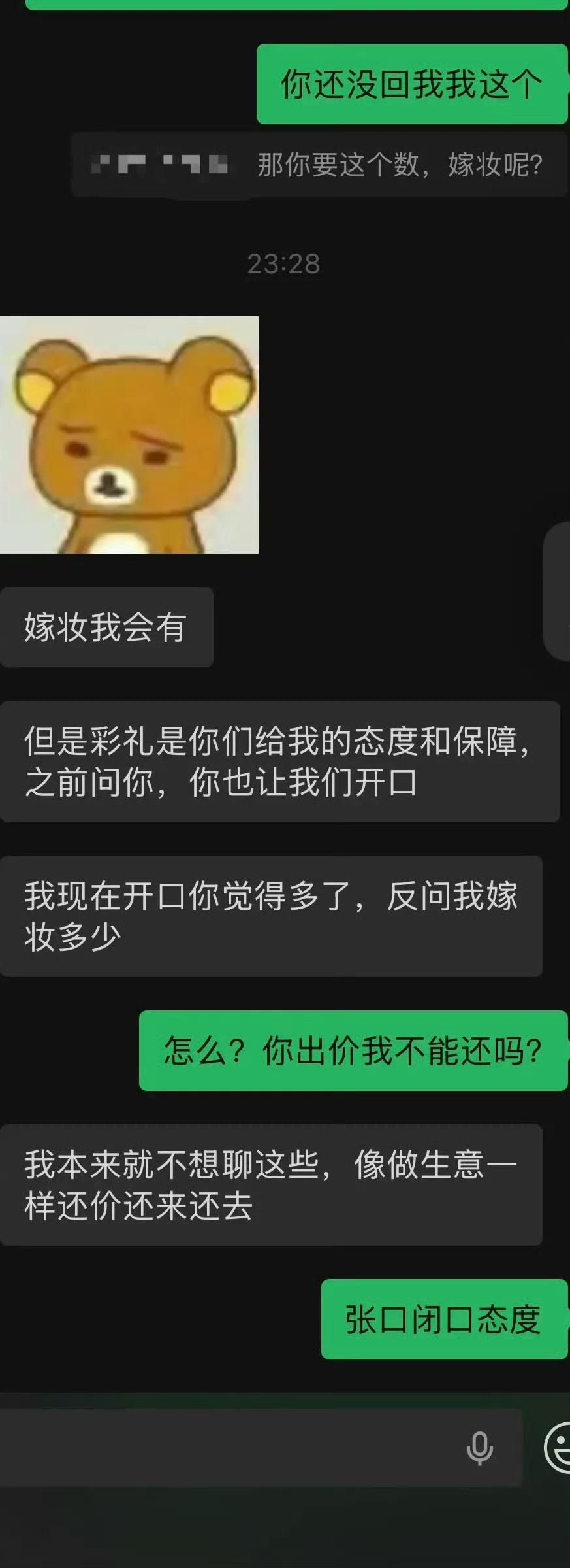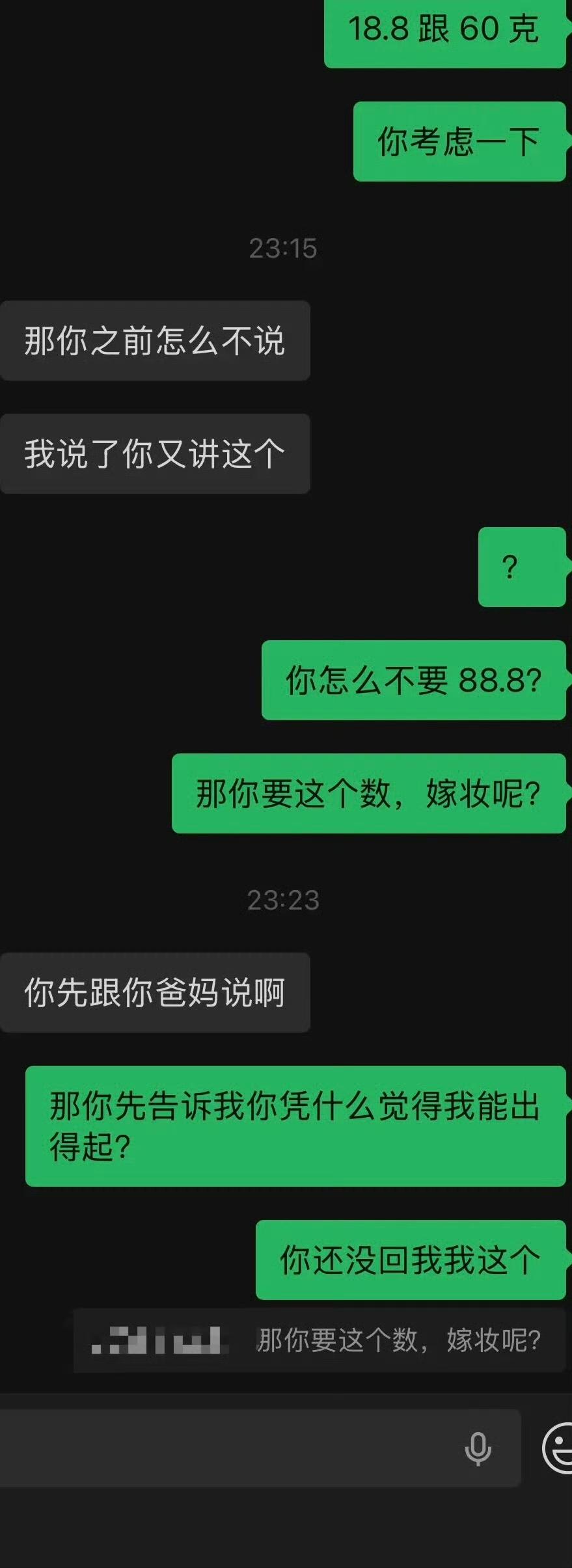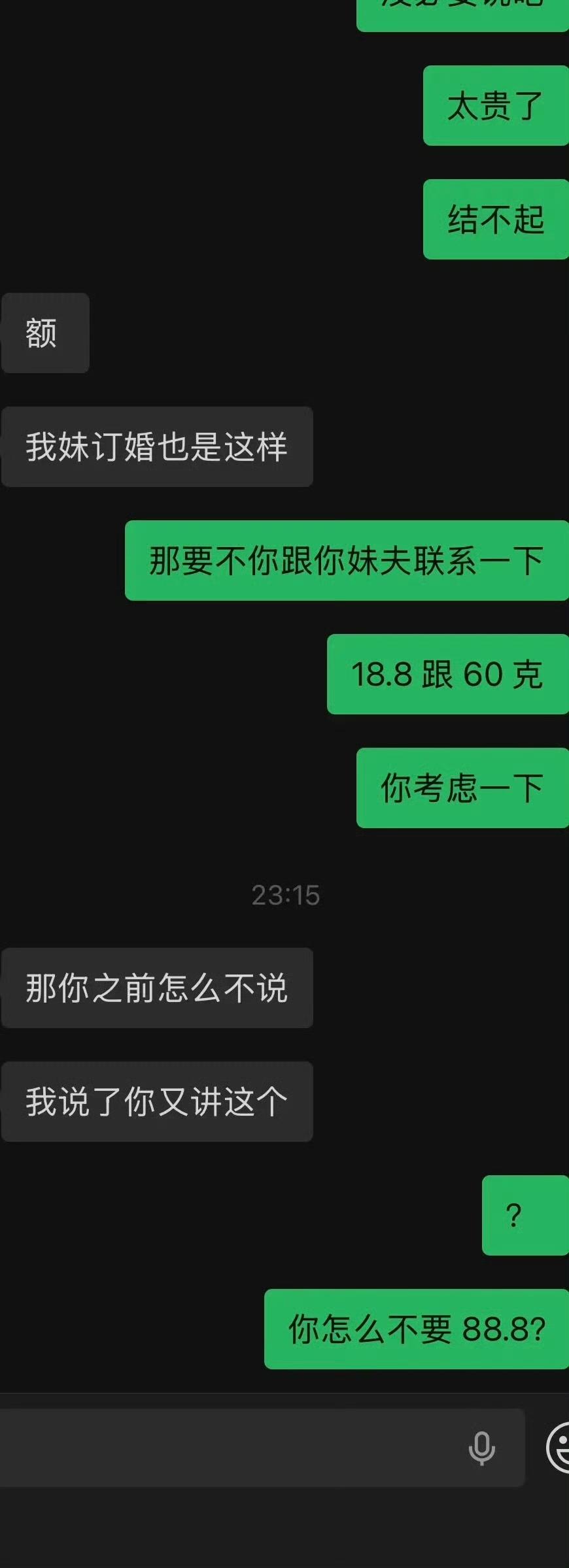 对象咬死 28.8 万,再加 100 克金子的彩礼,男方坚决不同意,坐标江苏苏北,现在彩礼都这么吓人了吗?男方 97 年的,女方 99 年的,他们在一起谈了 4 年,照理说应该感情很稳定,谈婚论嫁时女方开口了,要参照她妹妹的标准,给 28.8 万的现金,外加 100 克的金子。男方听到这个彩礼的要求,直接吓了一跳,问女方,这是她的要求,还是她爸妈的要求?女方说是她的。男方考虑了一下,提了一个折中的方案,18.8 万,外加 60 克金子,这是他家的极限,女方却不同意。现在为彩礼双方僵持住了,你们说这个有解吗?