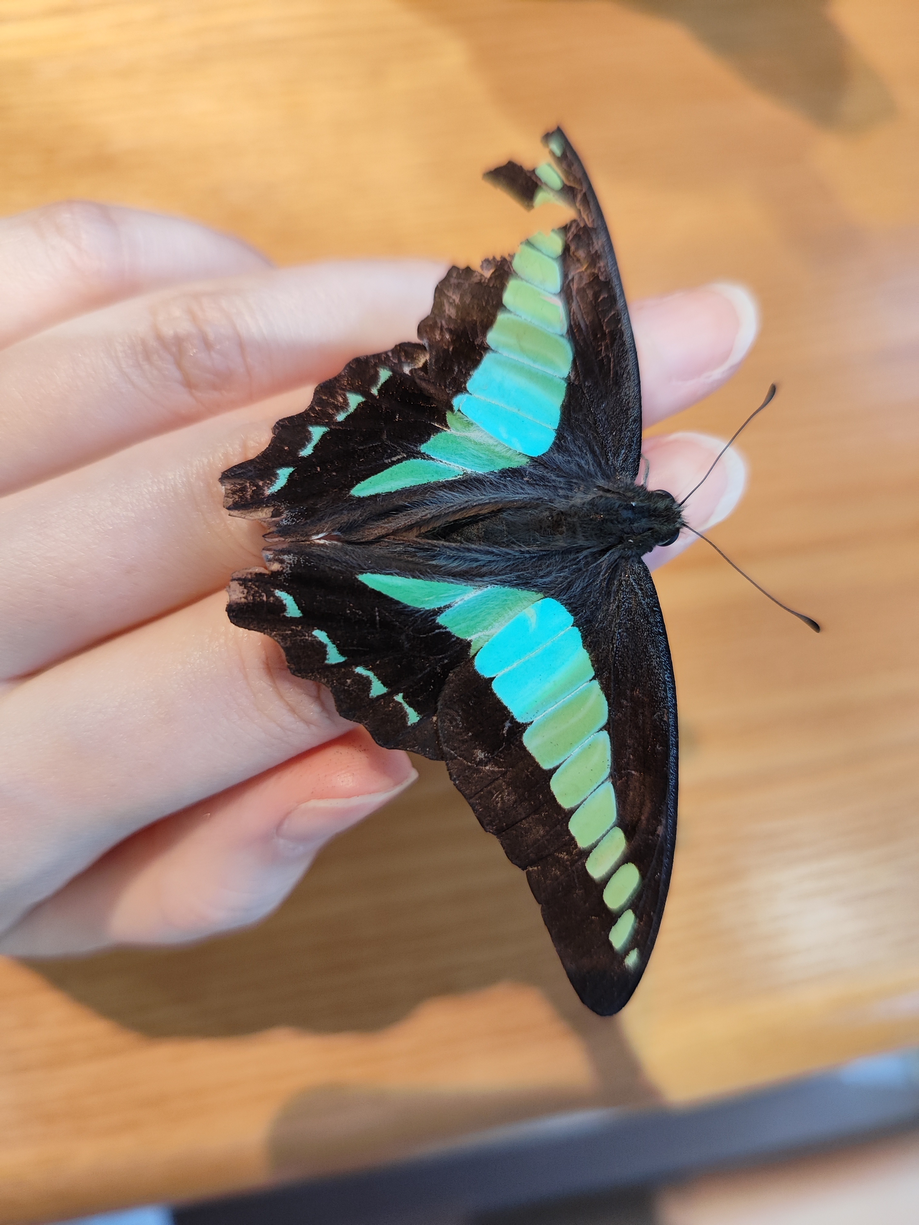 刚刚吃饭的时候有只蝴蝶飞到我脚边一直没飞走,仔细一看才发现原来翅膀受伤了,可怜🦋