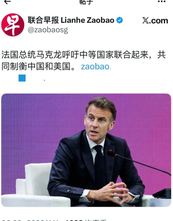 人在韩国,马克龙呼吁近 50 国联合起来,开辟第 3 条路线,共同制衡中国和美国! 新加坡《联合早报》4 号报道说,马克龙访问韩国时在延世大学发表了讲话,呼吁 “中等国家” 联合起来,共同制衡中国和美国。结合俄罗斯《塔斯社》的消息,马克龙在演讲中是这么说的: “我认为我们的目标不是成为两个霸权国家的附庸。应该说,我们不想成为任何一个霸权国家的附庸。我们既不想依赖中国的主导地位,也不想过多地受制于美国的不可预测性。如果韩国、法国也认同这样的目标,并联合其他欧洲国家、加拿大、日本、印度、巴西、澳大利亚,我们就能开辟一条第三条道路。” 马克龙在演讲里虽然没明着骂美国,但话里话外都在吐槽美国的不可靠,还拿伊拉克、阿富汗战争举例,说光靠轰炸和军事行动解决不了问题,其实就是在跟美国的强硬路线划清界限。 就在马克龙访亚前几天,2026 年 3 月 31 日,以色列宣布彻底切断和法国的军事贸易往来,把原本给法国的军火订单全转到了美国和德国,原因就是法国出台了禁令,不允许装载作战弹药、飞往以色列的飞机飞越法国领空。 同一天,特朗普还在社交媒体上连发怒文,怒斥法国不配合美国的政策,可法国一点都没服软,直接回怼说自己的政策一直没变,对特朗普的指责感到惊讶。 不光法国,德国、西班牙等 5 个欧洲国家也跟着法国一起,限制美军机过境,拒绝美军使用本国军事基地,这说明欧洲国家早就不想一直当美国的附庸了,马克龙这时候站出来呼吁,也是摸准了这种心思。 可他想拉的那些国家,其实个个都有自己的小算盘,根本不是真心想跟着他搞 “第三条路线”。 马克龙在演讲里特意提到韩国,想拉韩国入伙,可韩国心里门儿清,自己的国家安全命脉还握在美国手里,驻韩美军一直都在,美韩安保条约也没废除,真要跟着马克龙制衡美国,韩国根本没那个底气。 而且韩国和中国的经贸往来特别密切,很多企业都依赖中国市场,不可能真的跟中国翻脸,所以马克龙演讲结束后,韩国总统李在明虽然和他谈了霍尔木兹海峡航运安全合作,却压根没提 “制衡中美” 这回事,明显是在敷衍。 再看日本,马克龙之前访日的时候,日本首相高市早苗虽然嘴上说要加强和印太国家的合作,回应马克龙的提议,但日本是美国的铁杆盟友,不管美国做什么,日本都不敢轻易背离。 就像之前下一代战斗机研发,日本明明和欧洲有合作基础,最后还是选了美国的盟友英国和意大利,可见日本根本不可能真正脱离美国,跟着马克龙走所谓的 “第三条路线”。 还有印度、巴西、加拿大这些国家,更是各有各的想法。 印度一直想当世界大国,奉行不结盟政策,不可能轻易站队;巴西更关心南美洲的事务,对全球霸权博弈没那么大兴趣;加拿大虽然是西方国家,但一直跟着美国的步伐,不可能真的跟美国对着干。 马克龙想把这些心思各异的国家凑到一起,说白了就是纸上谈兵,根本没有稳定的共同利益基础。 更矛盾的是,马克龙一边呼吁 “不依赖中国、不受制于美国”,一边又不想彻底得罪任何一方。有消息说,2026 年 6 月要举办 G7 峰会,马克龙有意邀请中国参会,这让日本特别紧张,还要求他慎重考虑。 这就看得很清楚了,马克龙所谓的 “第三条路线”,其实就是想在中美之间找平衡,既想借助中国的市场和影响力,又想摆脱美国的控制,同时还能提升法国在国际上的地位,可这种左右逢源的想法,根本不现实。 而且从实际情况来看,现在全球化已经深入发展,不管是欧洲还是亚洲的国家,供应链、产业链早就和中美深度绑定了,硬要强行脱离,不仅成本极高,还会损害自己的利益。 马克龙这次访亚,虽然带了 200 多家法国企业,想在核能、AI 等领域和日韩合作,看似务实,可这些企业合作,根本形成不了地缘政治上的合力,也改变不了各国依赖中美的现状。 还有法国自身的问题,马克龙一直喊着 “欧洲战略自主”,可欧洲内部本身就不统一,很多欧洲国家依然依赖美国的安全保护,美国在欧洲还有大量军事基地和核武器,欧洲想真正自主,难度极大。 马克龙连欧洲都团结不了,还想拉着全球近 50 个国家搞 “第三条路线”,未免太不切实际了。 其实说到底,马克龙的这番呼吁,更像是一场外交秀。他想通过这种方式,彰显法国的大国地位,转移国内的矛盾,同时在中美之间争取更多筹码。 可现实是,没有哪个国家愿意为了法国的 “理想”,去得罪中美这两个大国,毕竟各国都是从自身利益出发。所谓的 “第三条路线”,听起来很美好,可实际上根本走不通,最后大概率只会变成一场热闹的独角戏。 毕竟,现在的国际格局,不是靠一句口号就能改变的,中美作为世界上两个大国,在全球经济、安全等领域都有着不可替代的作用,任何国家都不可能真正脱离中美,搞所谓的 “独立路线”。马克龙的想法虽然看似有道理,但忽略了最基本的现实,最后也只能是不了了之。