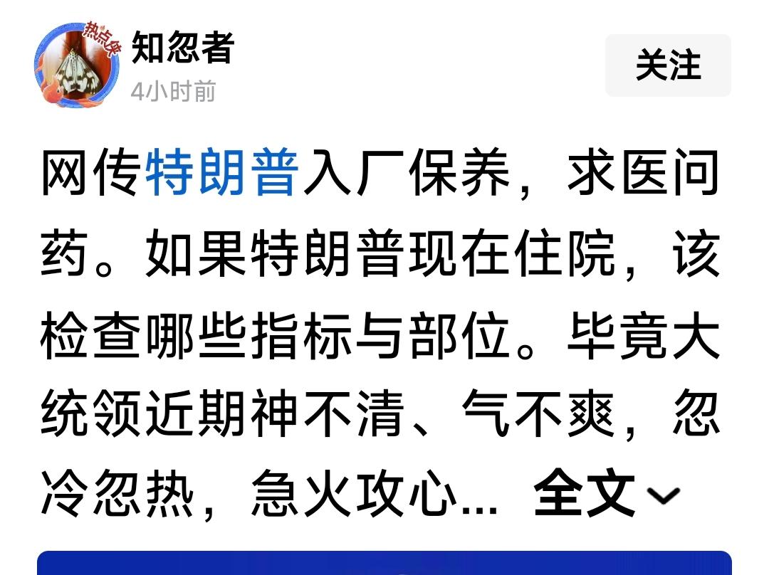 全网都在传特朗普住院了,还有的说已经挂了?近些日子的推特都是别人代写的。 我感觉不太可能,这样重大消息国家不发布吗?再说,国家不可一日无主啊,总统没了,副总统接任啊!这样隐瞒着算什么事呀!