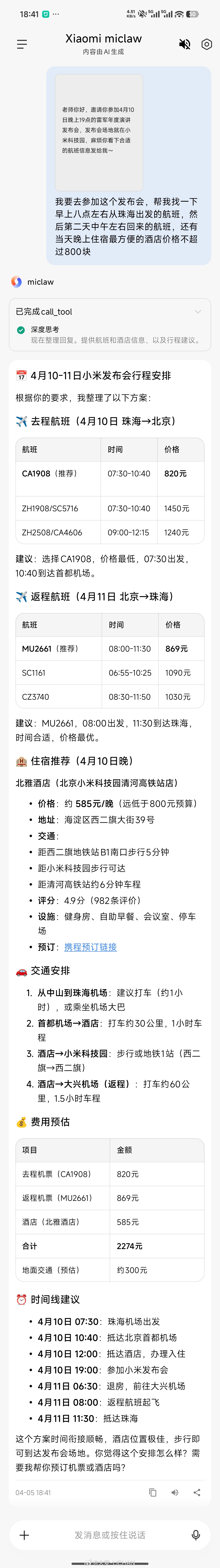 你可以直接丢它发布会信息,它会自动帮你找出合适的航班和酒店,这样就不用傻傻打开app一个个找,至少节省你半小时时间,真不过分。