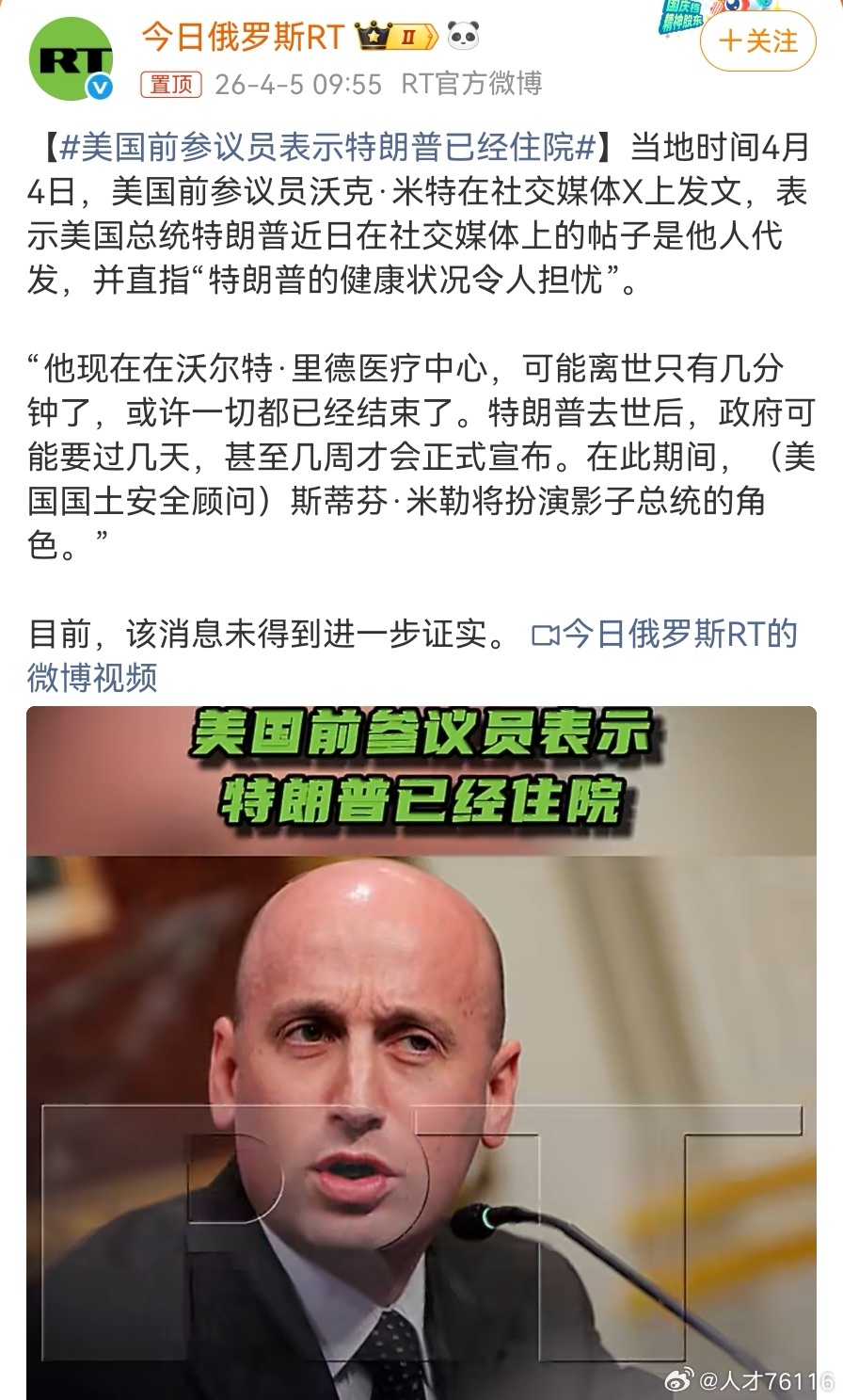 【美国前参议员:美国前参议员表示特朗普已经住院,“可能离世只有几分钟了”】不会吧,真的假的?2026年见识了太多名人突然走了,特朗普也中招了?他不是一直盼着访问心心念念的中国吗,这个可是他多年未成实现的愿望啊。 当地时间4月4日,美国前参议员沃克·米特在社交媒体X上发文,表示美国总统特朗普近日在社交媒体上的帖子是他人代发,“他现在在沃尔特·里德医疗中心,可能离世只有几分钟了,或许一切都已经结束了。特朗普去世后,政府可能要过几天,甚至几周才会正式宣布。在此期间,(美国国土安全顾问)斯蒂芬·米勒将扮演影子总统的角色。”