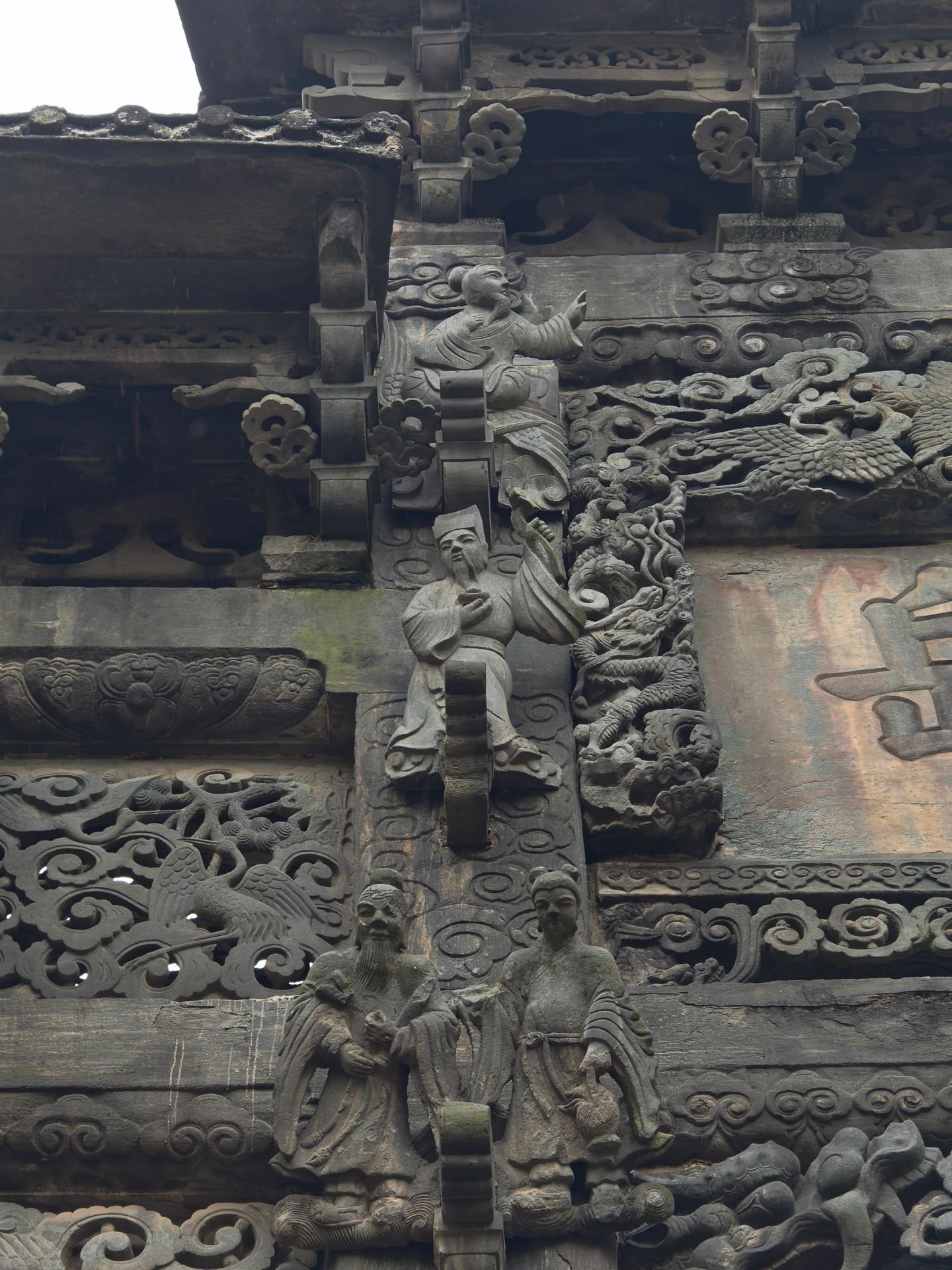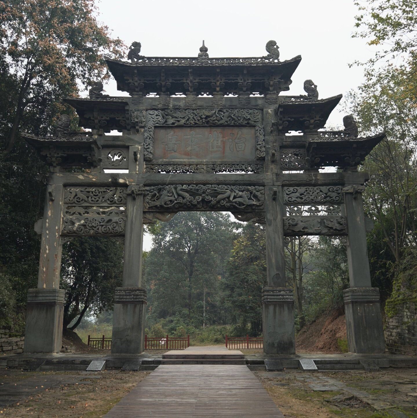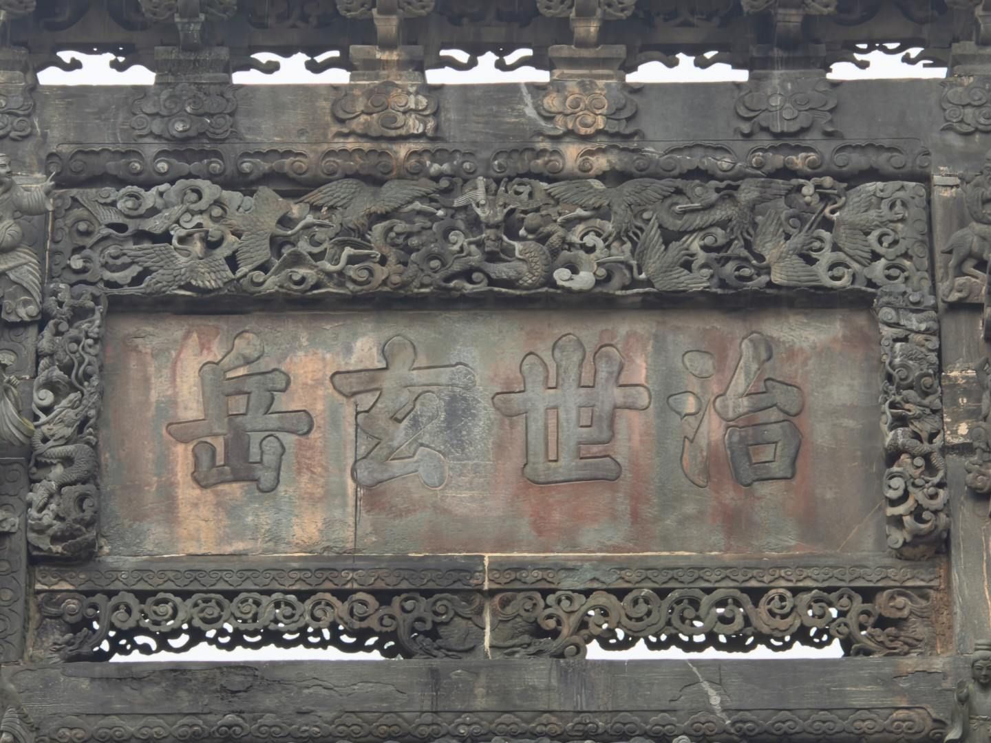 治世玄岳牌坊位于湖北武当山北麓,为明嘉靖三十一年敕建,是武当山神道起点,1988年被列为第三批全国重点文物保护单位。牌坊为三间四柱五楼青石仿木结构,通高11.9米,面阔14.5米,通体雕刻精美,匾额为嘉靖御书“治世玄岳”。“治世玄岳”牌坊为石凿仿大木建筑结构,三间四柱五楼牌坊,石凿桦卯而成,下部是四根长方巨柱,组成三孔宏门。牌坊运用线刻、圆雕、浮雕等方法在额坊、檐椽、栏柱、花窗上,刻着仙鹤流云和八仙人物故事;坊下有鳌鱼相对,卷尾支撑;顶饰鸥吻吞脊,檐下坊缀以各种花卉图案,整坊结构简练,构件富于变化,全用卯拼合装配均衡严谨,坊身装饰华丽。它不仅是明代石雕艺术的巅峰之作,更承载着“以道治世”的政治理念,将武当山尊为凌驾五岳之上的皇家道教圣地。作为仙凡分界的象征,牌坊兼具宗教教化意义与历史价值,是明代皇家崇道的标志性建筑。