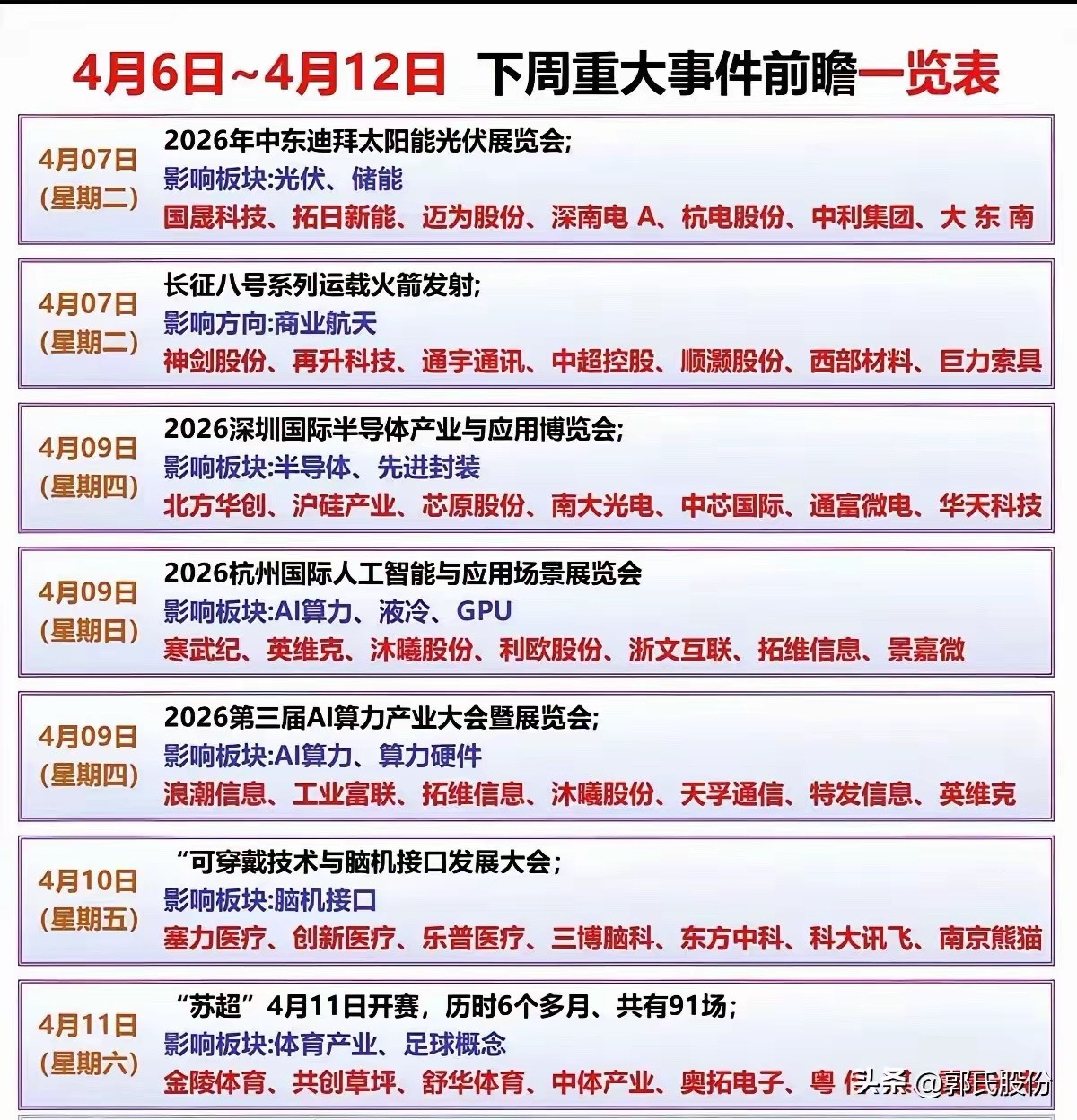 下周行情“核按钮”:四大顶级盛会+体育盛宴,谁将引爆万亿赛道?4月6日至12日,资本市场迎来罕见的“事件驱动超级周”。从AI硬件的极致内卷到新能源的海外博弈,再到脑机接口的未来叙事与“苏超”点燃的体育激情,多重重磅事件密集排布,为A股注入了强烈的短线张力。以下深度拆解本周核心看点:一、 AI算力“极限拉扯”:深圳与杭州的“双城记”本周AI赛道迎来两场重量级展会,算力与半导体的自主可控成为绝对主线。半导体突围(4月9日·深圳):国际半导体博览会聚焦先进封装。在当前外部技术封锁背景下,国产设备的突围尤为关键。北方华创、中芯国际等龙头企业的技术进展,将是资金衡量“国产替代”进度的核心标尺。算力狂欢(4月9日·杭州):AI算力大会叠加应用场景展,直击当下最热的AI算力、液冷与GPU。随着大模型迭代提速,算力基础设施的扩容迫在眉睫。浪潮信息、寒武纪以及英维克(液冷温控)有望成为资金扎堆的“避风港”。二、 商业航天“飞天”在即:长征八号的战略意义火箭发射(4月7日):长征八号系列发射不仅是一次常规任务,更是我国商业航天迈向“高密度发射”的关键一步。随着卫星互联网加速组网,上游的特种材料、火箭零部件需求爆发。神剑股份、通宇通讯等低位标的或迎来脉冲式炒作。三、 黑科技前瞻:脑机接口的“从0到1”可穿戴与脑机接口大会(4月10日):作为颠覆性技术,脑机接口正从实验室走向医疗应用。创新医疗、三博脑科等拥有实质业务布局的企业,将是市场对“未来医疗”想象力的最佳载体,极易催生出超预期的短线情绪溢价。四、 体育消费“苏醒”:江苏足球点燃激情“苏超”开赛(4月11日):历时半年、91场比赛的江苏省足球超级联赛,不仅是地方体育盛事,更是体育大年(欧洲杯前夕)的重要预热。赛事经济带动金陵体育、共创草坪等产业链标的,体育概念有望借势起飞。总结:本周策略建议“重科技、轻指数”。重点关注深圳半导体展(国产替代)与杭州算力大会(AI基建)带来的确定性机会,同时博弈脑机接口的高弹性与苏超的短平快情绪释放。在事件驱动下,板块轮动或将加速,建议围绕核心龙头进行狙击。