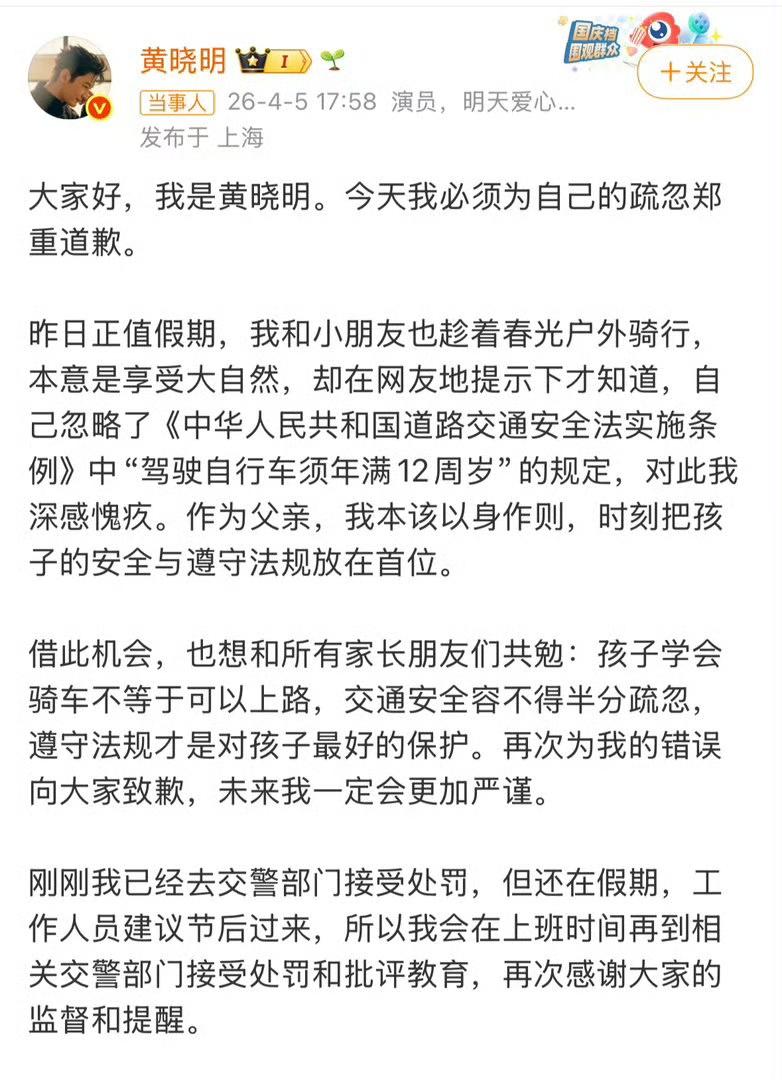 黄晓明,知错就改! 黄晓明自己也没想到,晒一下自己和9岁儿子小海绵骑自行车的照片,竟被网友揪出违反了两项交通法规,温馨画面秒变普法现场。 第一个错,就是小海绵没到12周岁,是不可以骑车上路的。 还一个错,就是没戴头盔,存在安全隐患。 不过网友指出来后,黄晓明马上发文道歉了,还主动去交代情况接受处罚。 公众人物的一言一行,都是孩子的教科书。黄晓明能知错就改,是最好的示范!