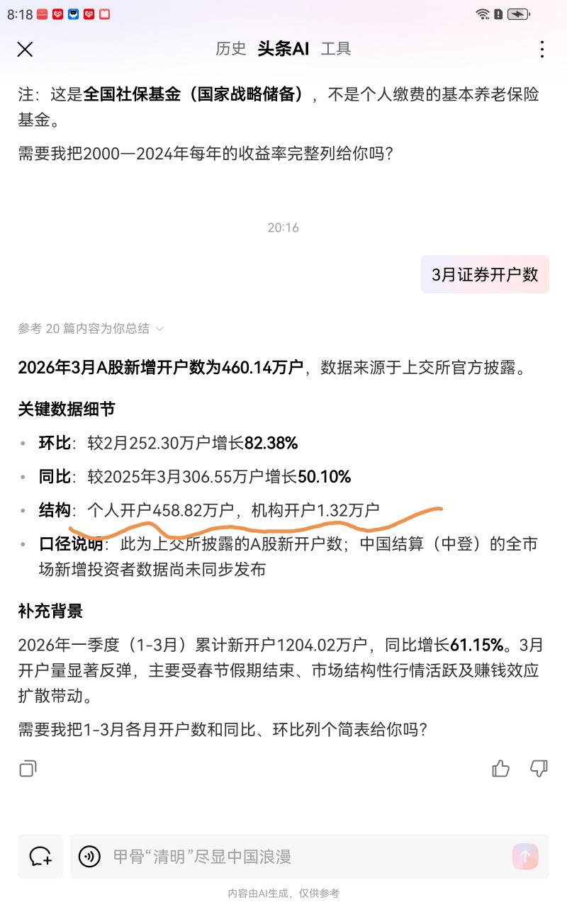 机构开户才是关键,散户小打小闹,掀不起风浪。//@e梧小桐:散户早割肉了,胆吓破了,你看看3月机构开户数多少?一万多户,机构啊,进来捡带血的筹码,你们亏不起的尽管割,大刀砍,反正有人捡。哈哈