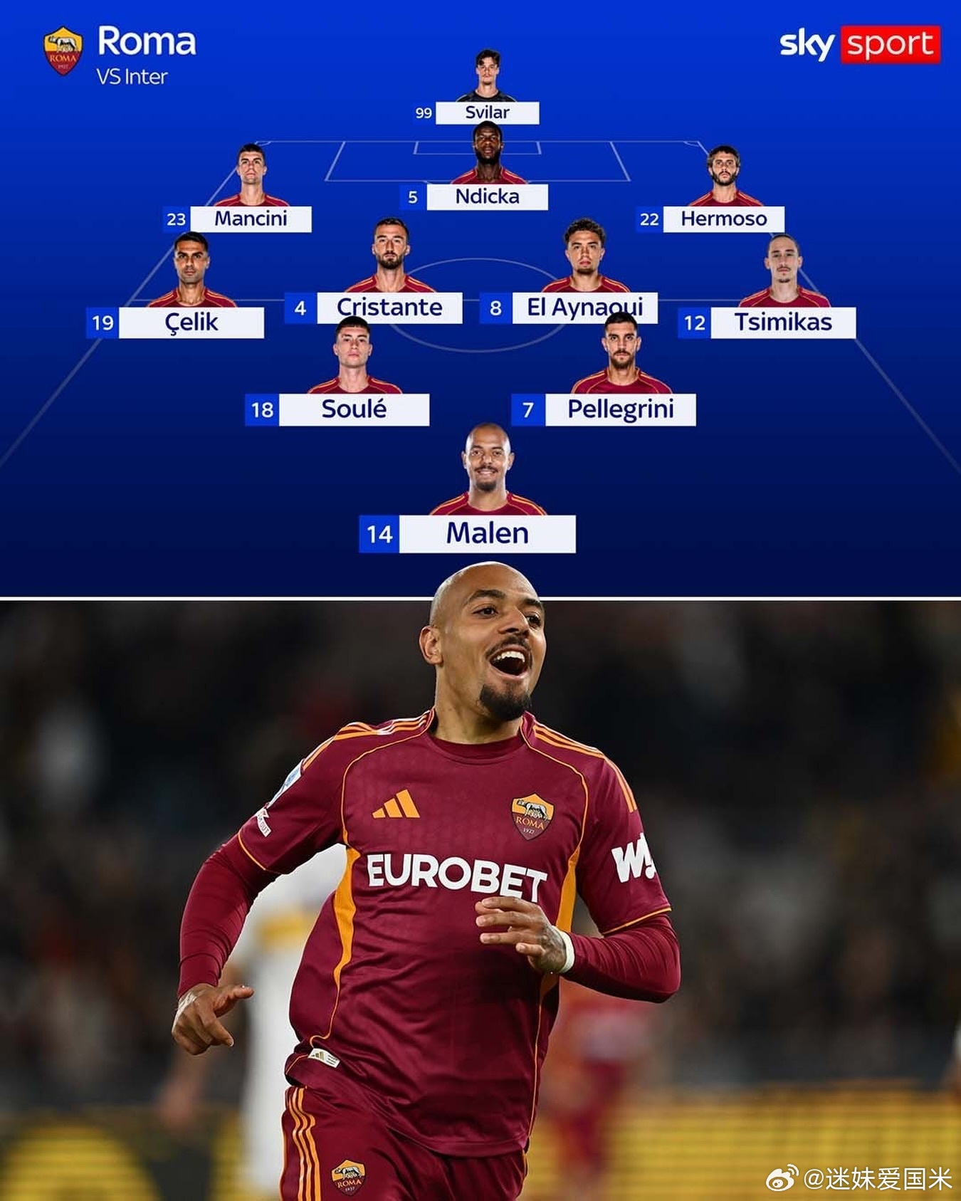天空体育更新了罗马队首发阵容,国际米兰要留意马伦,这个荷兰前锋在意甲适应的很好。国际米兰意甲国际米兰vs罗马