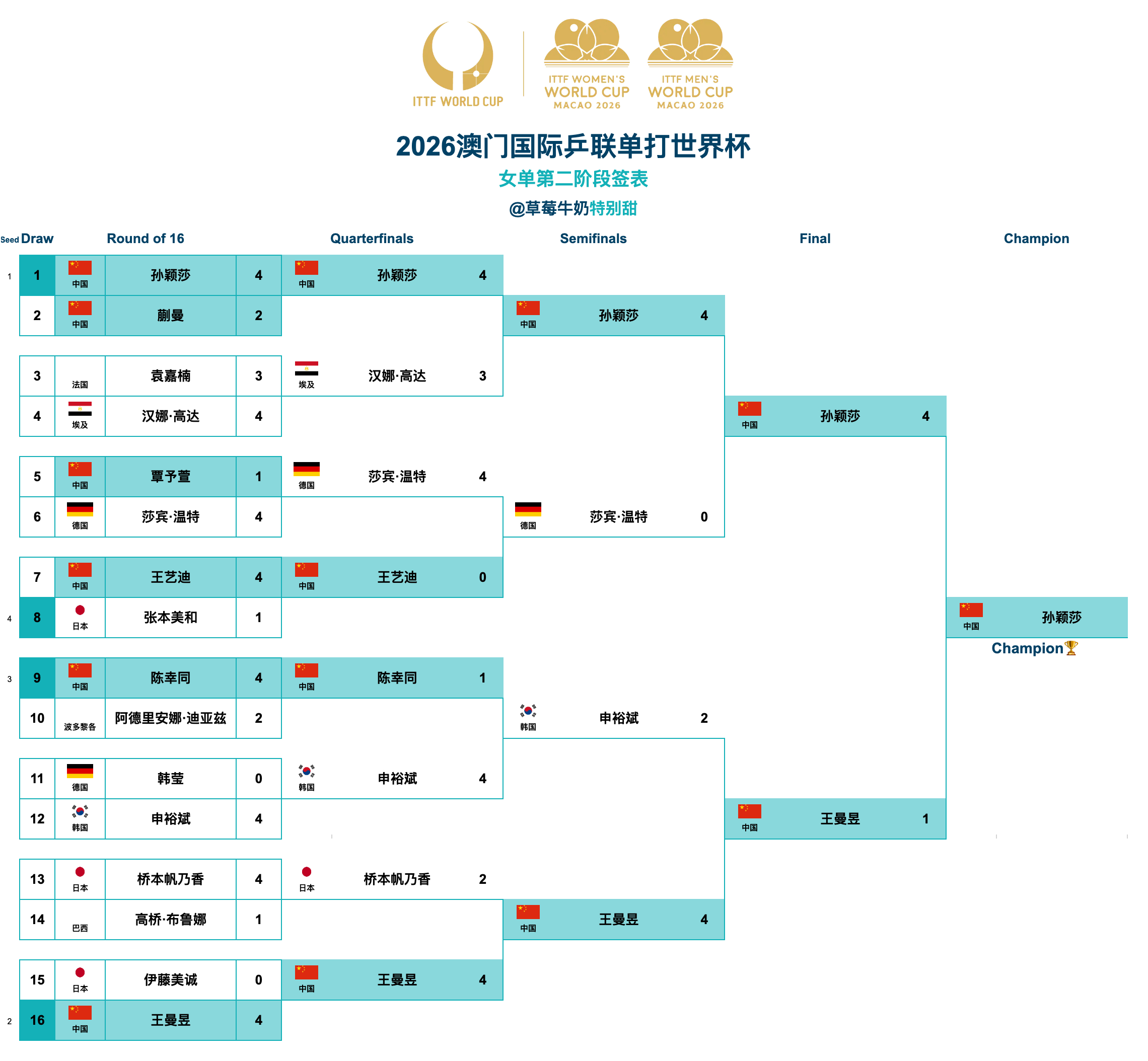 2026澳门国际乒联单打世界杯丨女单决赛孙颖莎🇨🇳4-1王曼昱🇨🇳【11-9,11-8,13-11,8-11,11-7】孙颖莎🇨🇳获得2026澳门国际乒联单打世界杯女单冠军🥇🎉王曼昱🇨🇳获得2026澳门国际乒联单打世界杯女单亚军🥈