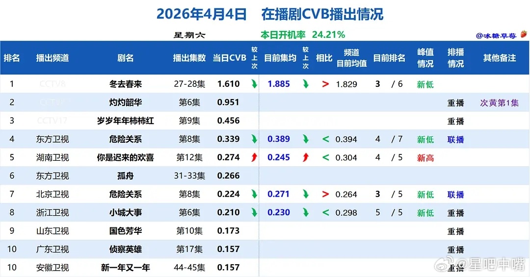 《冬去春来》前28集cvb集均1.885,最后四集cvb约1.70!那么总和:1.885×28+1.70×4=59.58集均:59.58÷32=1.862