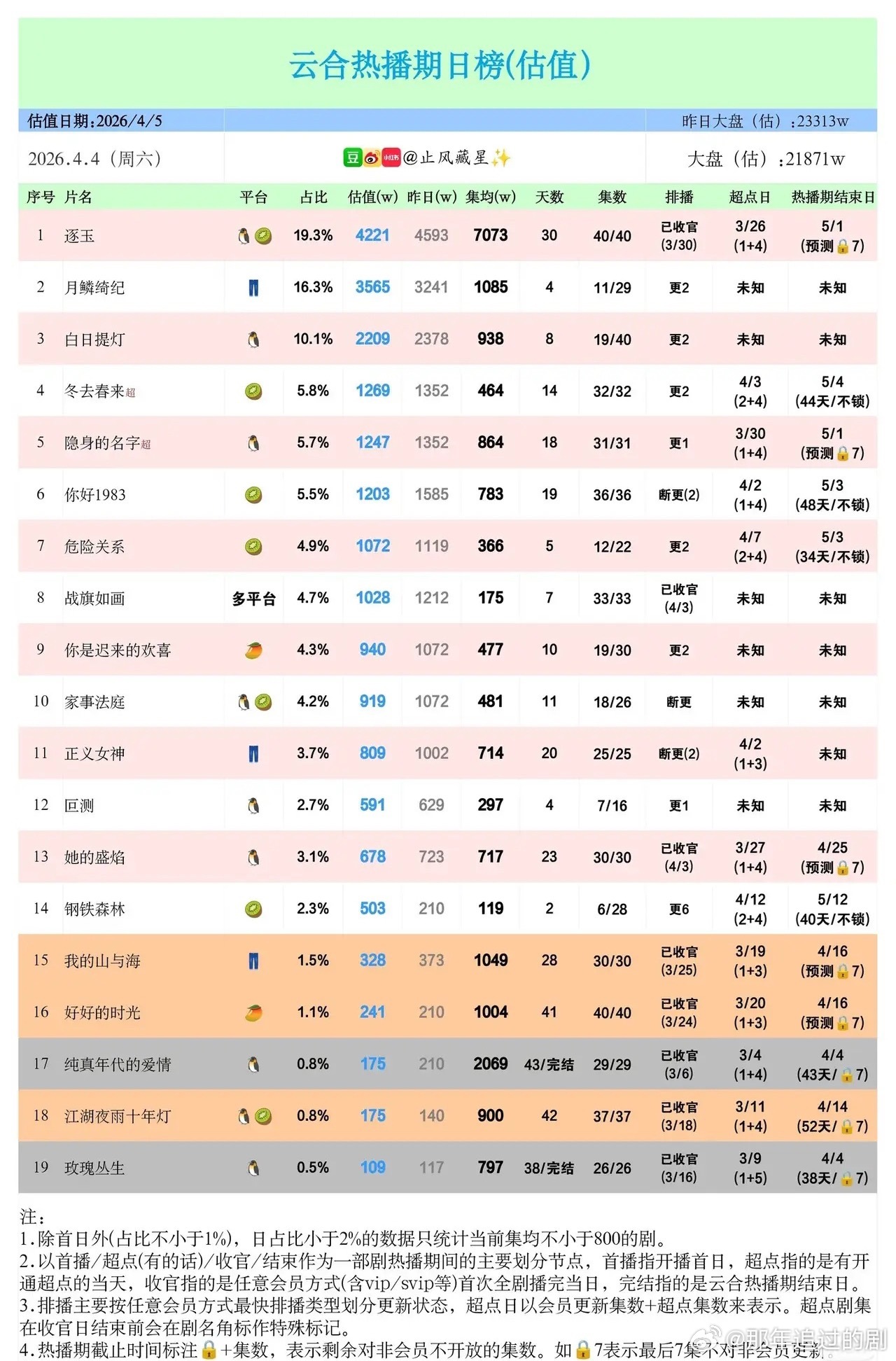 4.4追剧日榜爆了!《琢玉》断层领跑太绝了《琢玉》直接杀疯了!以4221w估值、19.3%占比断层第一,集均7073的成绩狠狠拉开第二名差距,不愧是开年黑马《月鳞绮纪》稳坐第二,3565w估值紧跟其后。没想到《纯真年代的爱情》集竟高达2069,虽排名靠后但单集数据超亮眼!《隐身的名字》《你好1983》也稳居前列,多部好剧扎堆太幸福~马年追剧氛围拉满,你正在追哪部?