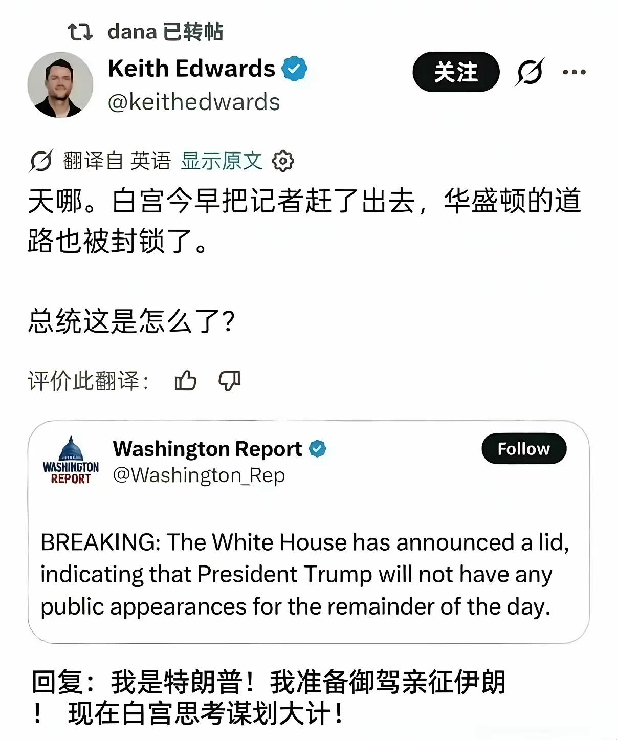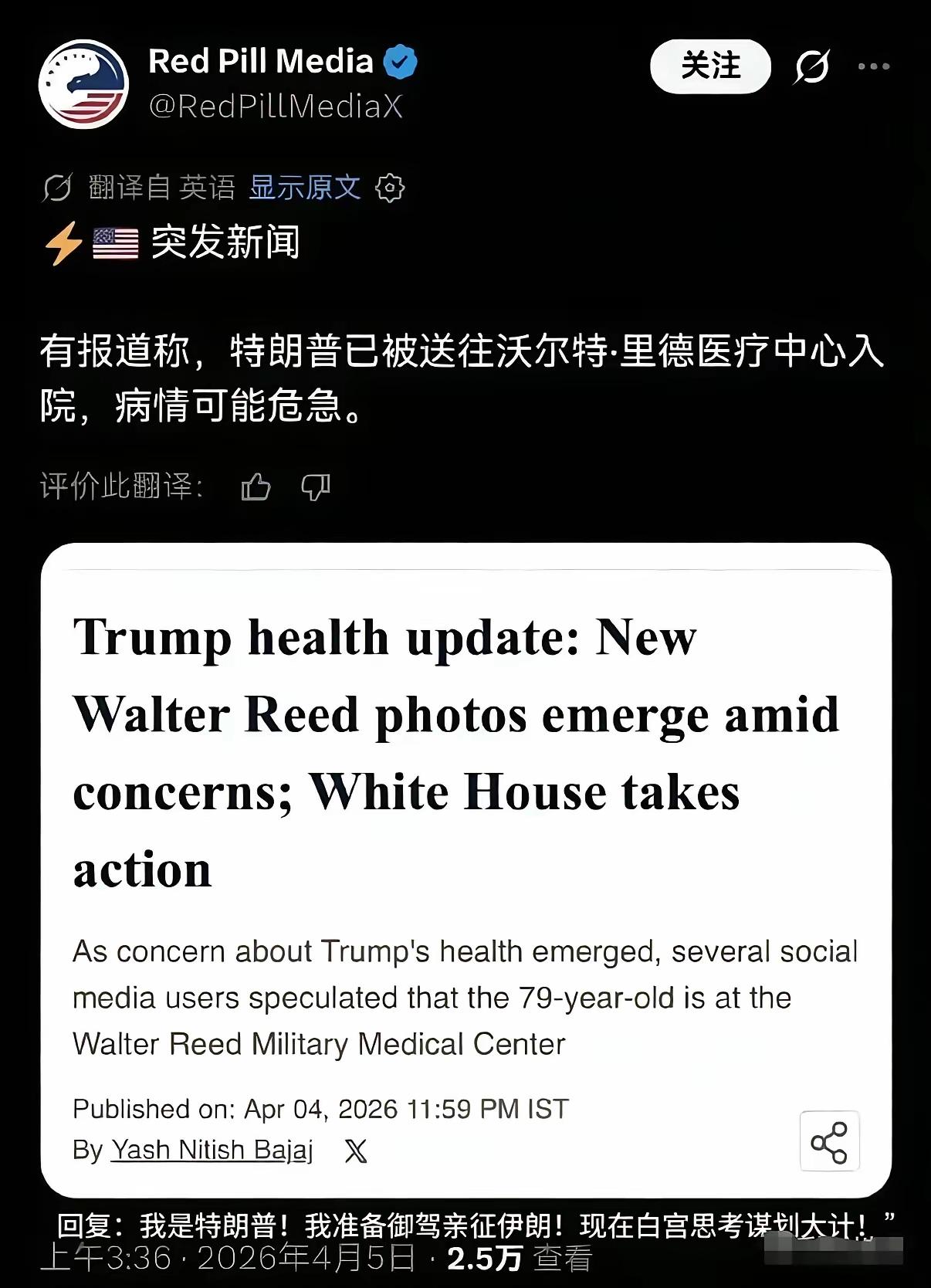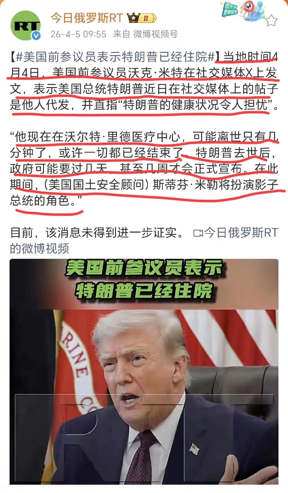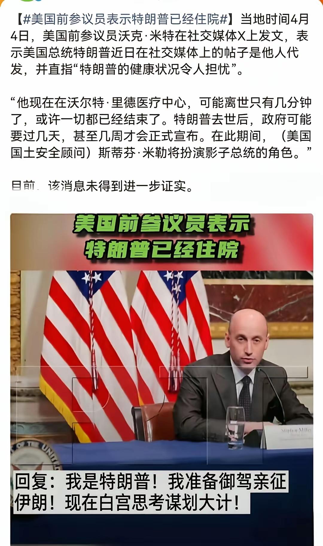 美国乱套了!特朗普已经死亡或者离死亡只有几分钟的消息在美国到处都是。 美国前参议员沃克·米特4月4日发文称,特朗普近日在社交媒体上的发文都是由他人代写的,而特朗普“他现在在沃尔特·里德医疗中心,可能离逝世只有几分钟了,或许一切都结束了……” 这些传闻是真是假,就看特朗普是否还能在他喜欢的新闻中出现了。尽管有一个声音在大喊“我是特朗普!我准备御驾亲征伊朗!现在白宫思考谋划大计!”但有人说,白宫一大早就把记者赶走了,华盛顿的道路也被封锁了”。 假如特朗普真的死了,全球会是怎样一个反应?是如释重负?还是感到寂寞和失落?