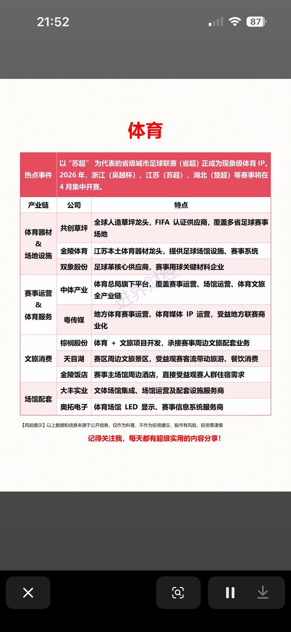 体育核心概念股 体育核心概念股最近可太火了!3月31日,中体产业(600158)午后强势封死涨停板,收报11.99元,大涨10%。全天成交额14.98亿元,换手率13.28%,交投超活跃。主力资金净流入2.15亿元,占总成交额14.35%,连续3日被增仓,近5日主力净流入达1.34亿元。 中体产业是国家体育总局旗下的中字头体育龙头,业务多元,体育服务贡献43.75%营收,产品销售占比25.95%。还参与赛事打造,与中足联合作,探索冰雪产业。 另外,A股体育概念股逆势上涨,舒华体育涨停,粤传媒、金陵体育等也有不错涨幅。体育概念股这波行情,值得关注!