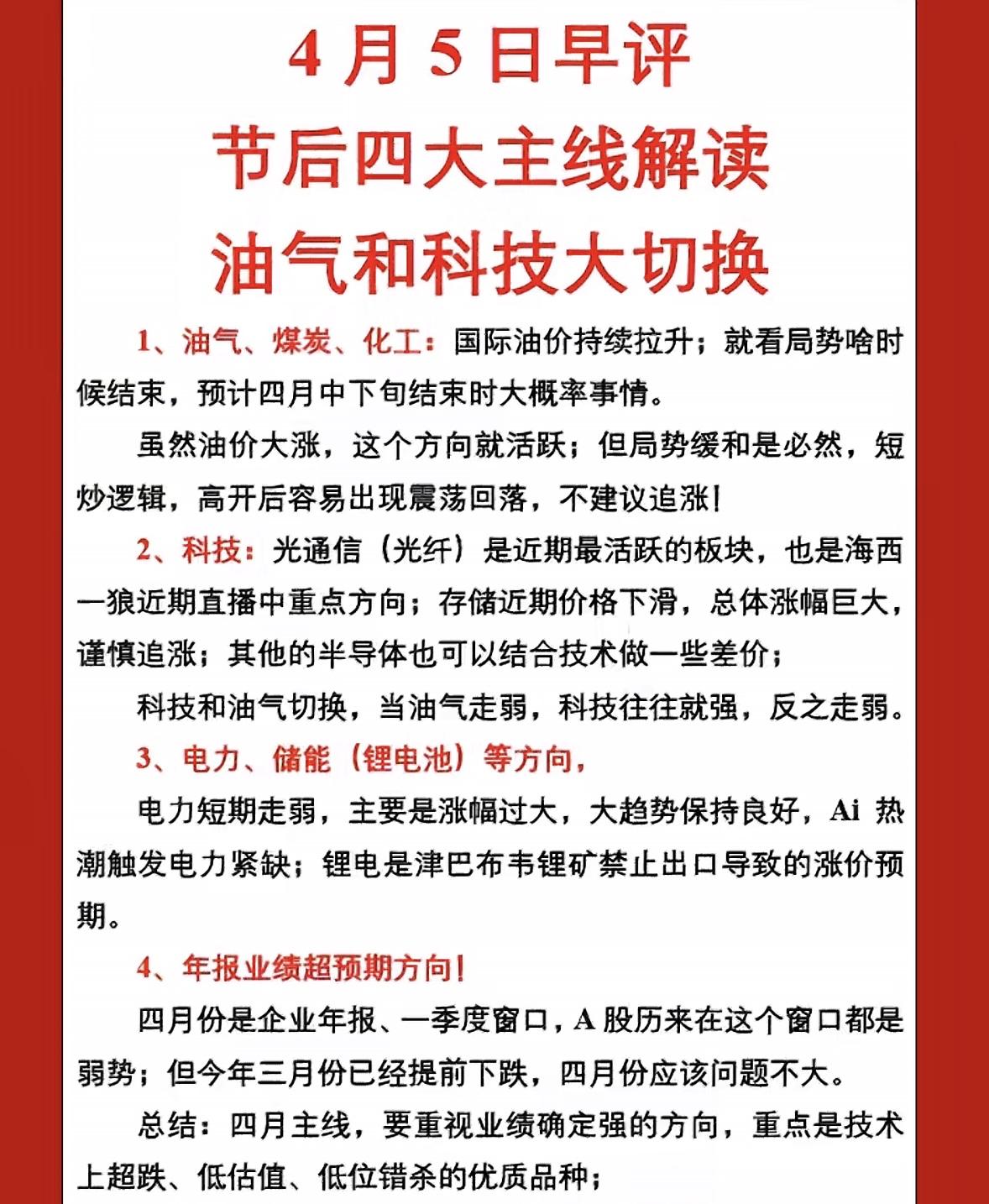 4月5日早评:节后四大主线解读,油气科技大切换! 4月5日早评说说节后四大主线。油气、煤炭、化工这块,国际油价持续拉升,不过局势缓和是必然,这属于短炒逻辑,高开后易震荡回落,别追涨,预计四月中下旬局势结束。 科技方面,光通信(光纤)近期很活跃,是重点方向;存储价格下滑且涨幅大,追涨得谨慎;半导体可结合技术做差价。 大盘上补缺口后走弱,周五通信设备等板块涨幅居前。证券指数创新低,说明市场规避不确定性。大银行股表现突出。 目前油气涨科技就跌,后续得留意这两者的大切换,操作上都得谨慎,别盲目跟风。