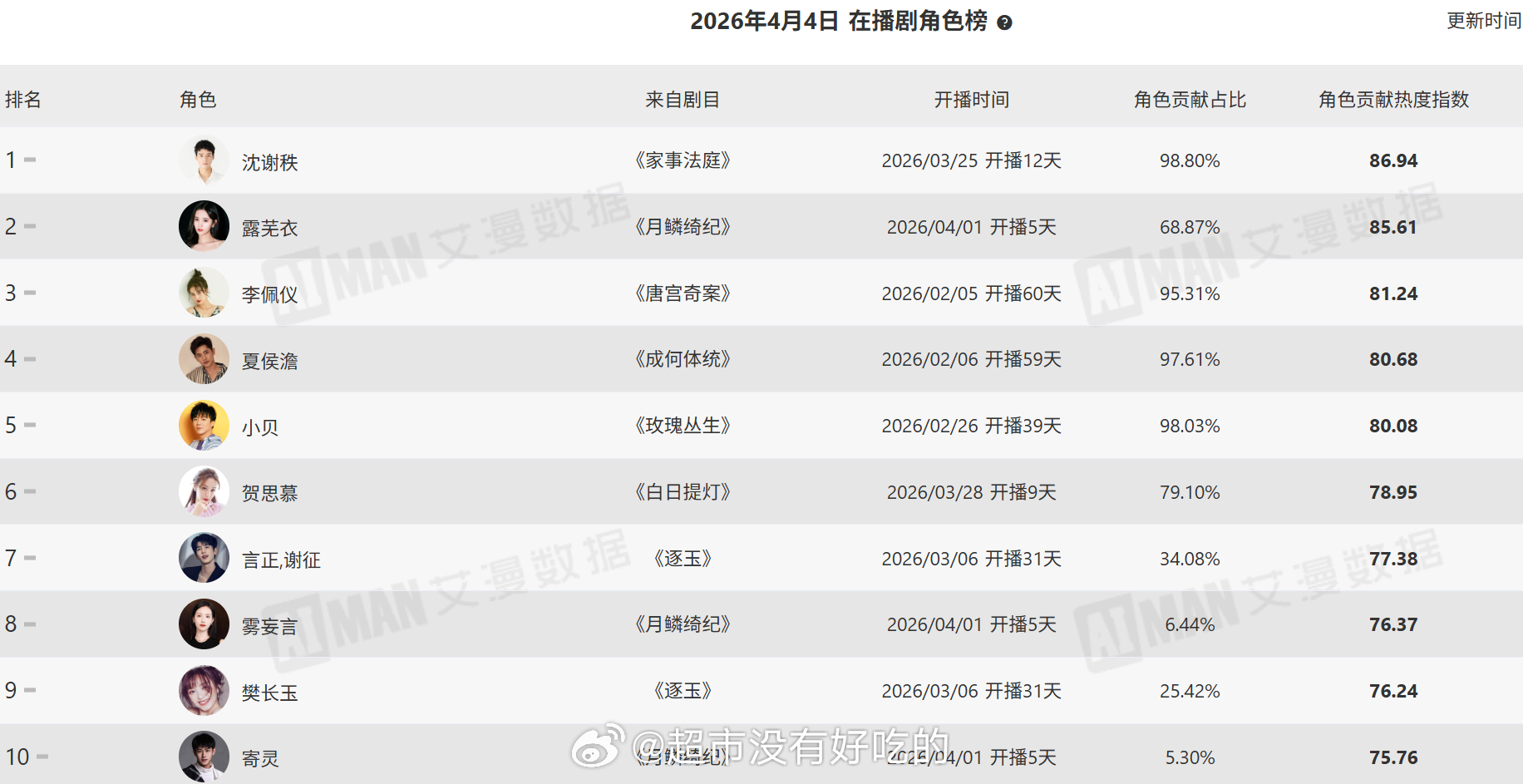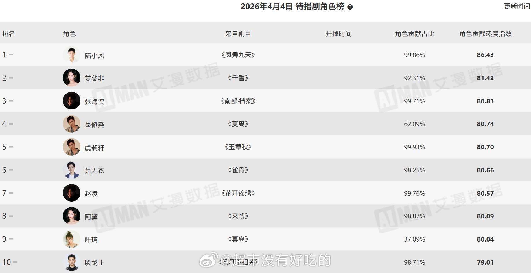 昨日电视剧角色热度指数榜、活跃受众榜龚俊在播剧和待播剧角色指数、活跃受众全部登顶